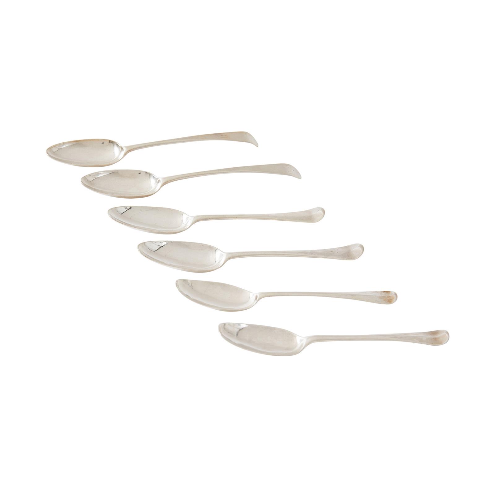 Each Old English pattern; one pair London 1748; one pair with maker's mark of John Millington, London, and date letter rubbed; the other pair with maker's mark of William Sumner & Richard Crossley, London 1779.