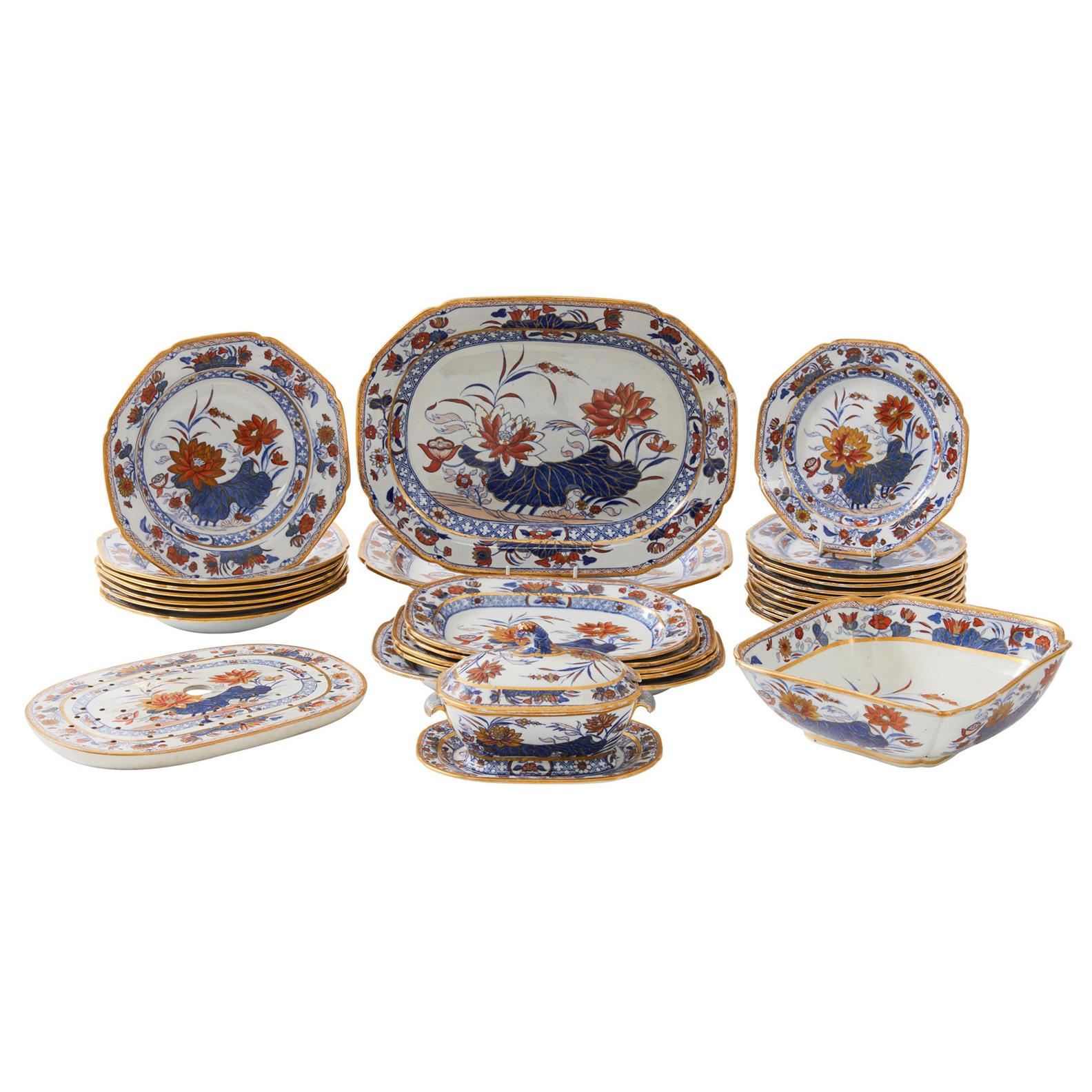 In the Lotus pattern, comprising platters, a sauce tureen and underplate, various bowls, plates and a square dish.