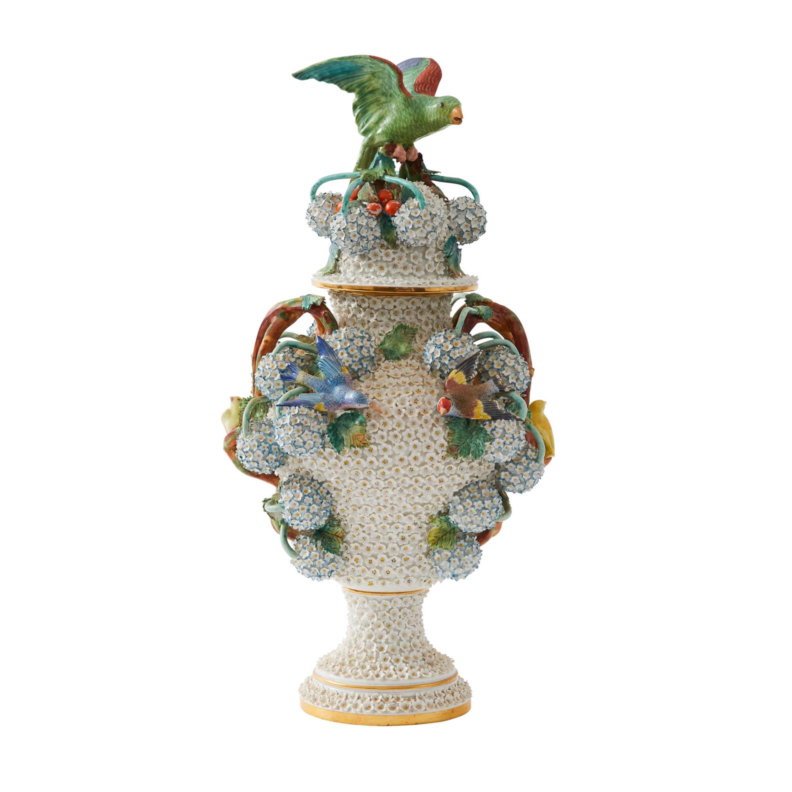 Late 19th century, blue crossed swords mark, of inverted pear shape, encrusted all-over with blossoms, trailing green vines and branches applied with coloured birds, the domed cover surmounted by a parrot.