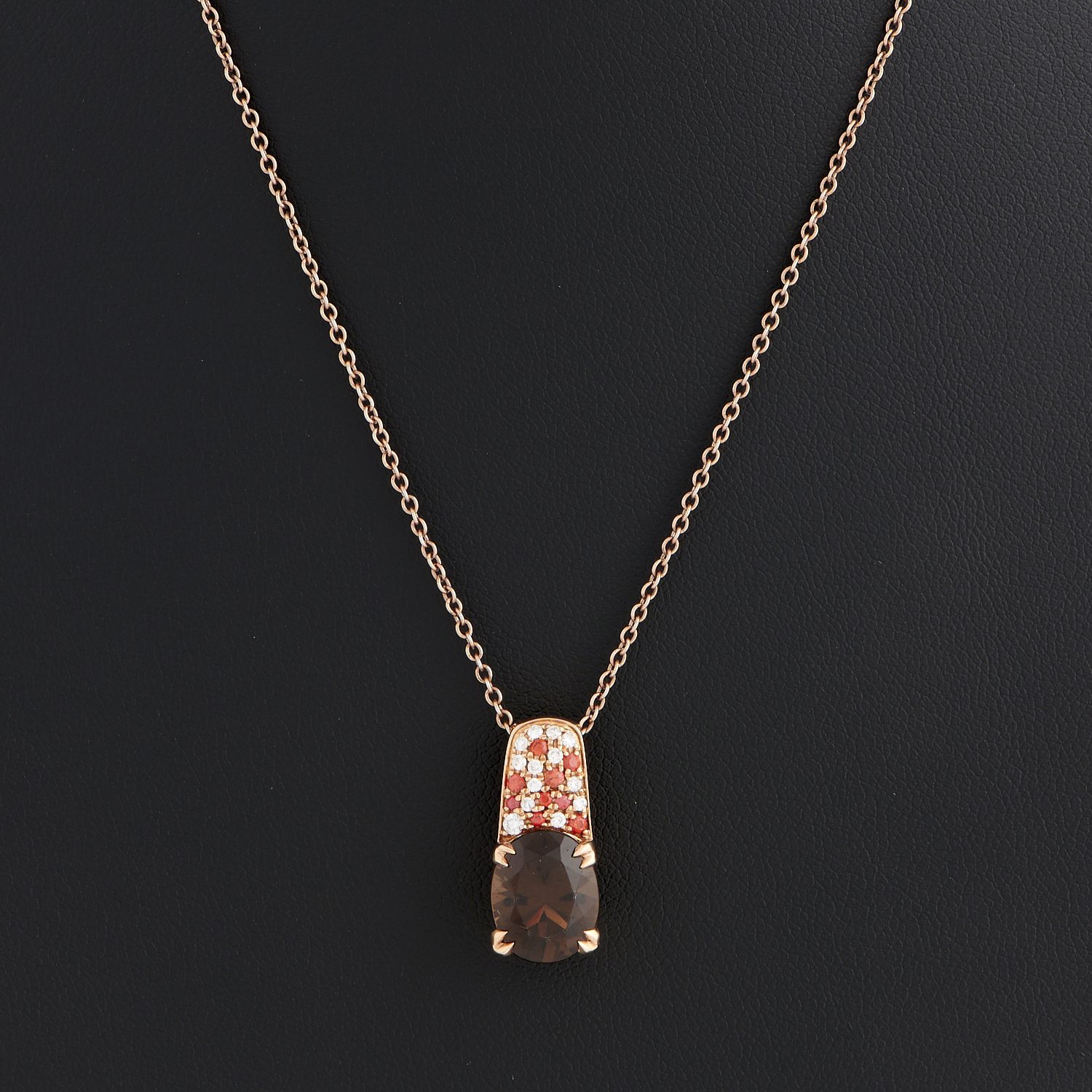 MAUBOUSSIN, A SMOKY QUARTZ, SAPPHIRE AND DIAMOND 'PLAISIR D'AMOUR' PENDANT NECKLACE IN 18CT ROSE GOLD, TO A FINE TRACE LINK CHAIN, 400MM