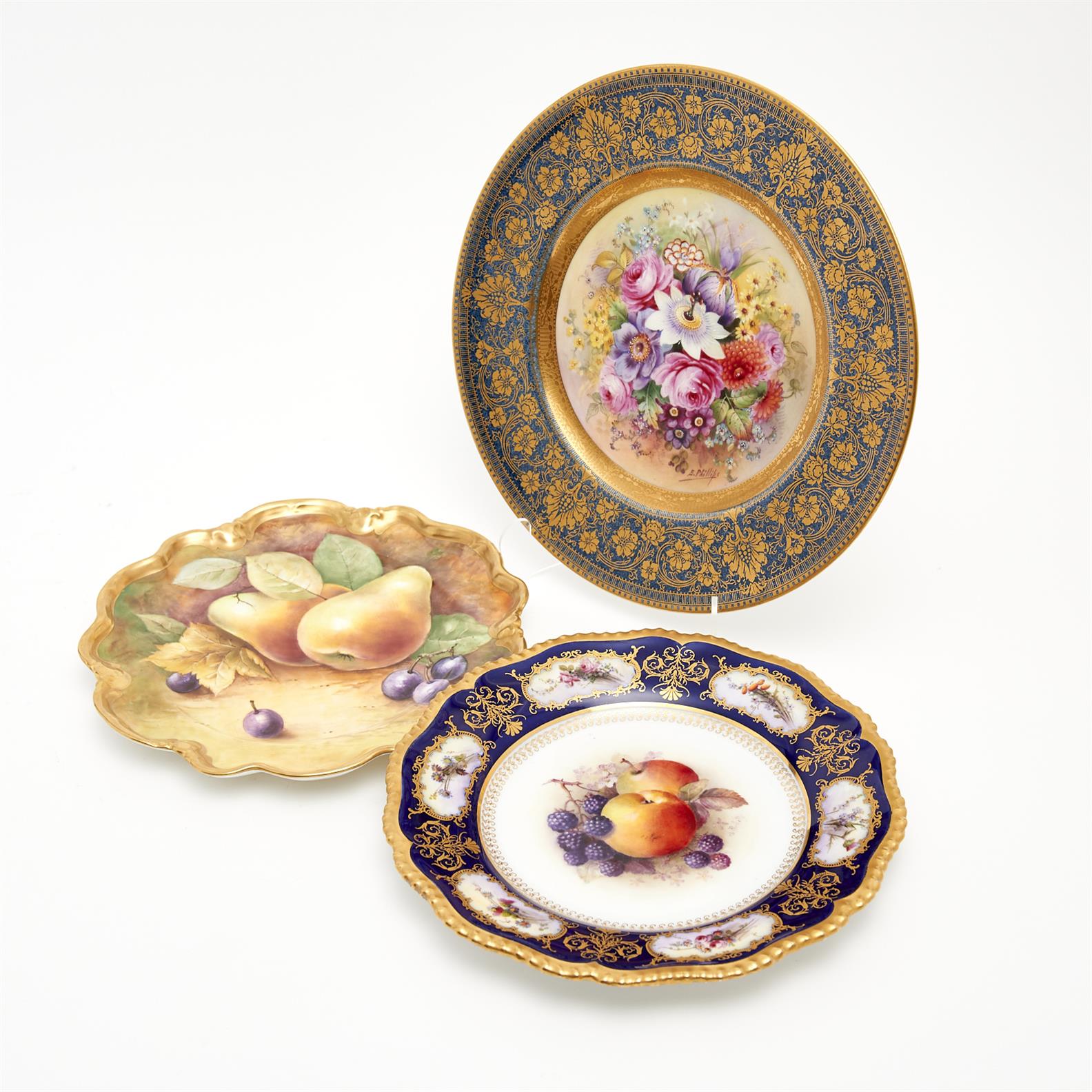THREE CABINET PLATES INCLUDING TWO ROYAL WORCESTER AND ONE COALPORT - ONE ROYAL WORCESTER SIGNED E. PHILLIPS, THE OTHER TWO WITH FRUIT AND BERRY DECORATION (A/F) DIA. 27.5CM (LARGEST) LEONARD JOEL DELIVERY SIZE: MEDIUM