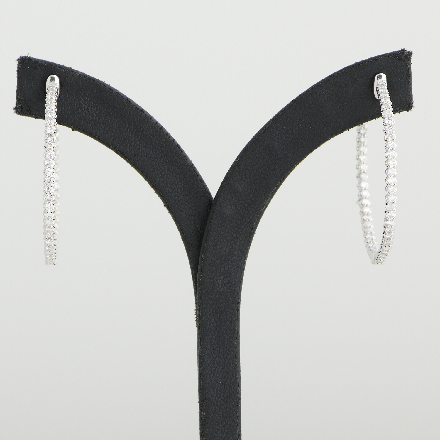 A PAIR OF DIAMOND HOOP EARRINGS IN 18CT WHITE GOLD, THE DIAMONDS TOTALLING 1.75CTS (G/VS) TO POST AND SCREW FITTINGS, 32MM, 6.8GMS