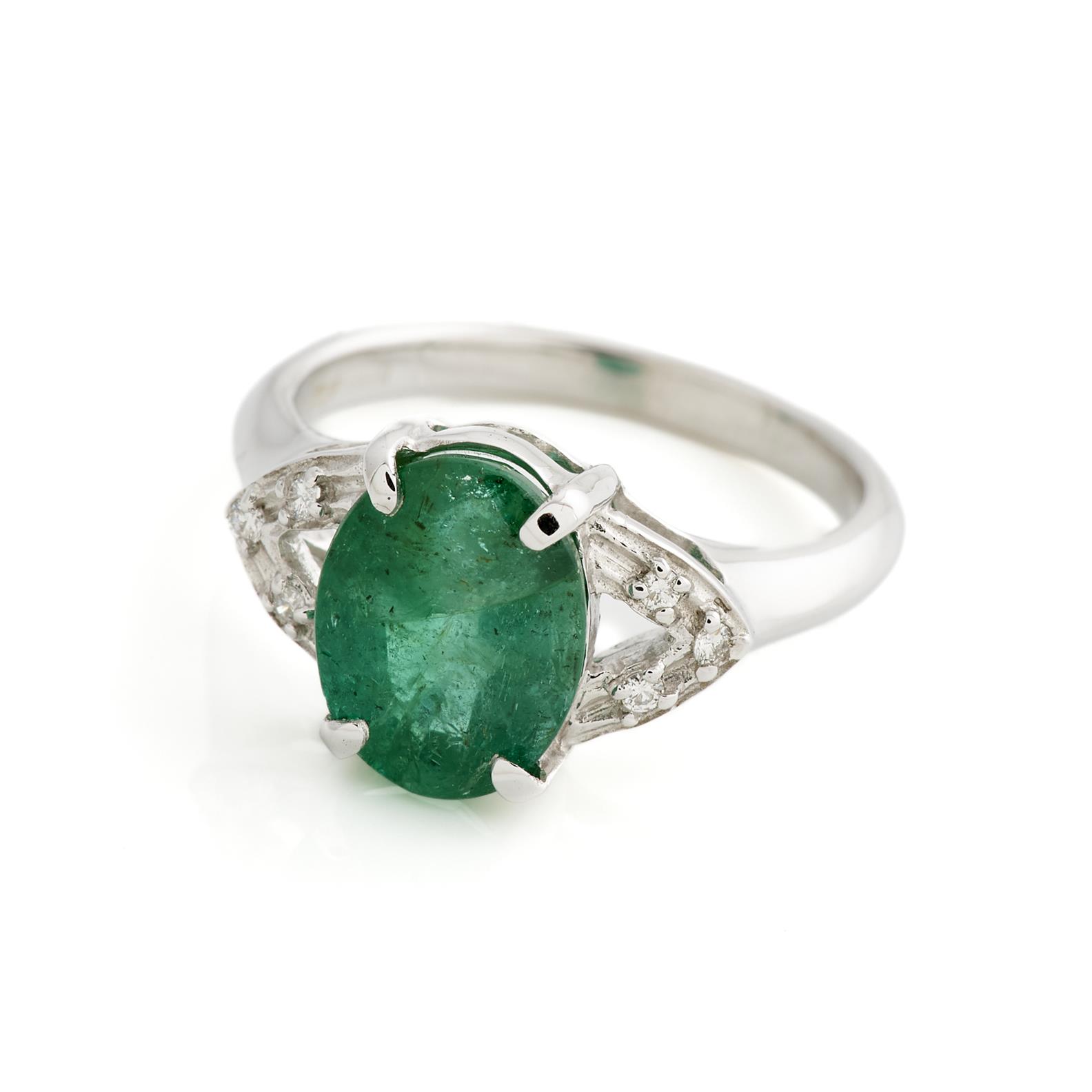 AN EMERALD AND DIAMOND RING IN 18CT WHITE GOLD, THE EMERALD WEIGHING 2.50CTS, SIZE L, 3.7GMS