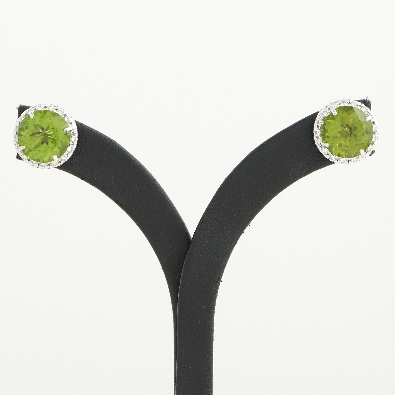 A PAIR OF PERIDOT EARRINGS WITH DETACHABLE DIAMOND HALOS IN 18CT WHITE GOLD, THE PERIDOTS TOTALLING 10.40CTS, TO POST AND BUTTERFLY FITTINGS