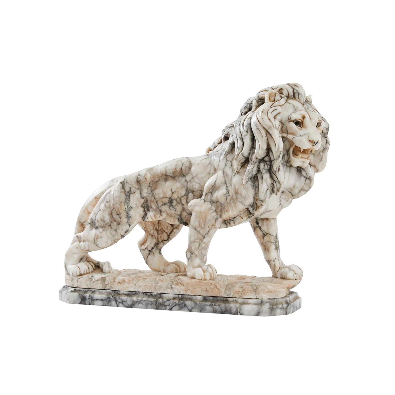 The king of the beasts in an aggressive pose standing four square and roaring, on a moulded plinth.