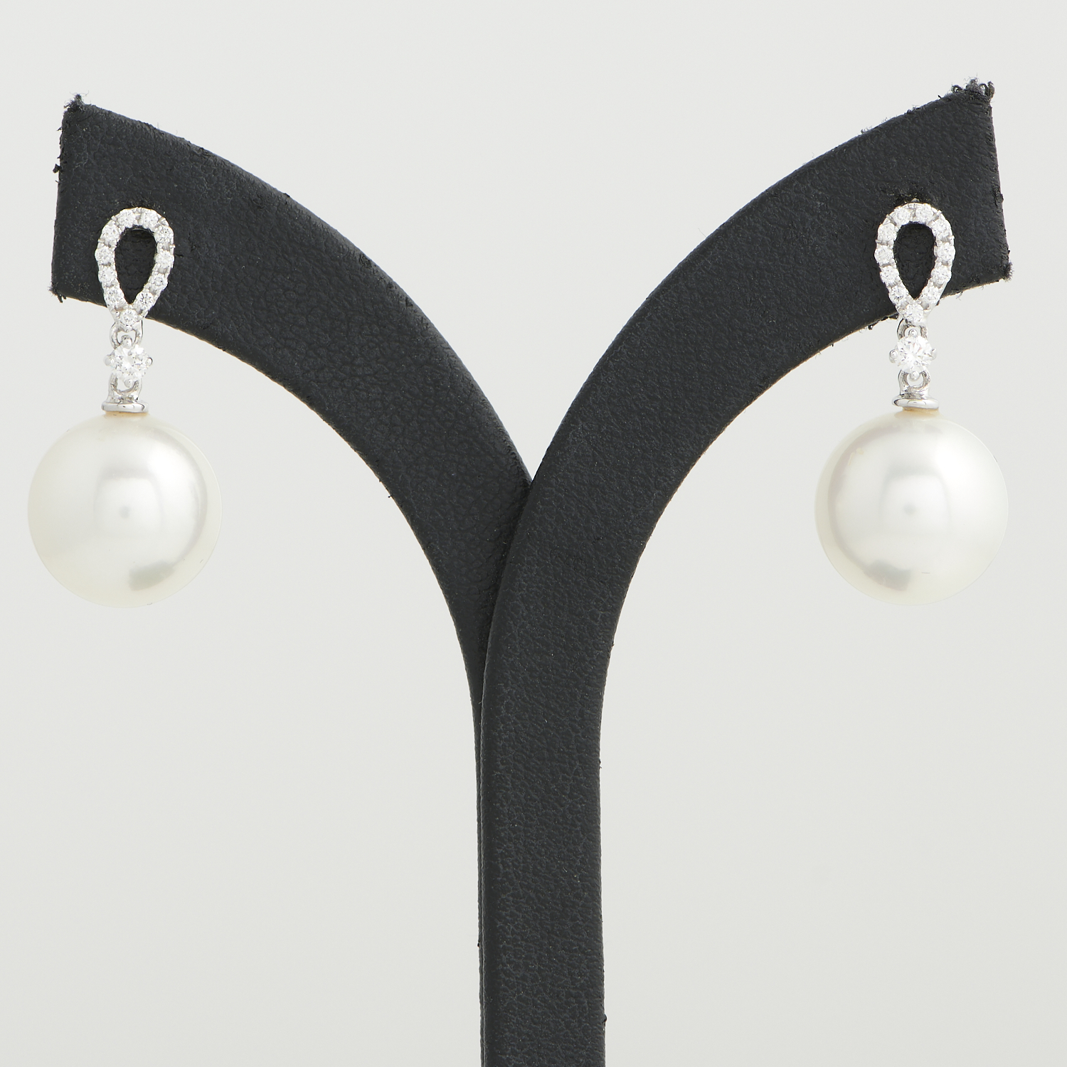 A PAIR OF SOUTH SEA PEARL AND DIAMOND EARRINGS IN 18CT WHITE GOLD, THE PEARLS MEASURING 12MM, THE DIAMONDS TOTALLING 0.24CTS, TO POST AND BUTTERFLY FITTINGS, 30MM