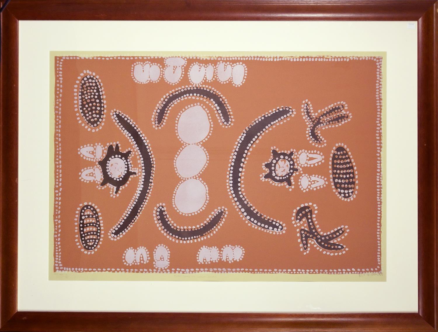 KITTEY MALARVIE, BUSH CAMP ON GORDON DOWNS, SCREENPRINT ED. 9/20, SIGNED, TITLED AND EDITIONED BELOW IMAGE, 66 X 100CM, FRAME SIZE: 100 X 134CM