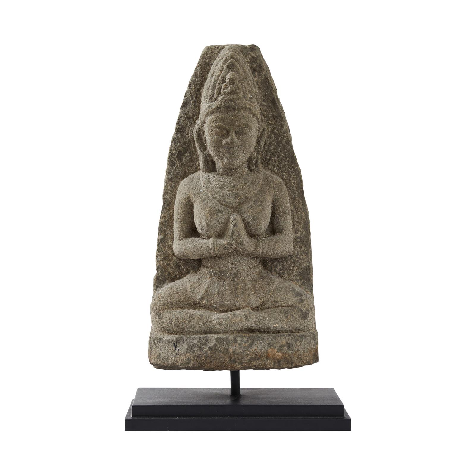 Champa period, 10th century, carved in relief of a seated female deity wearing a conical headdress.