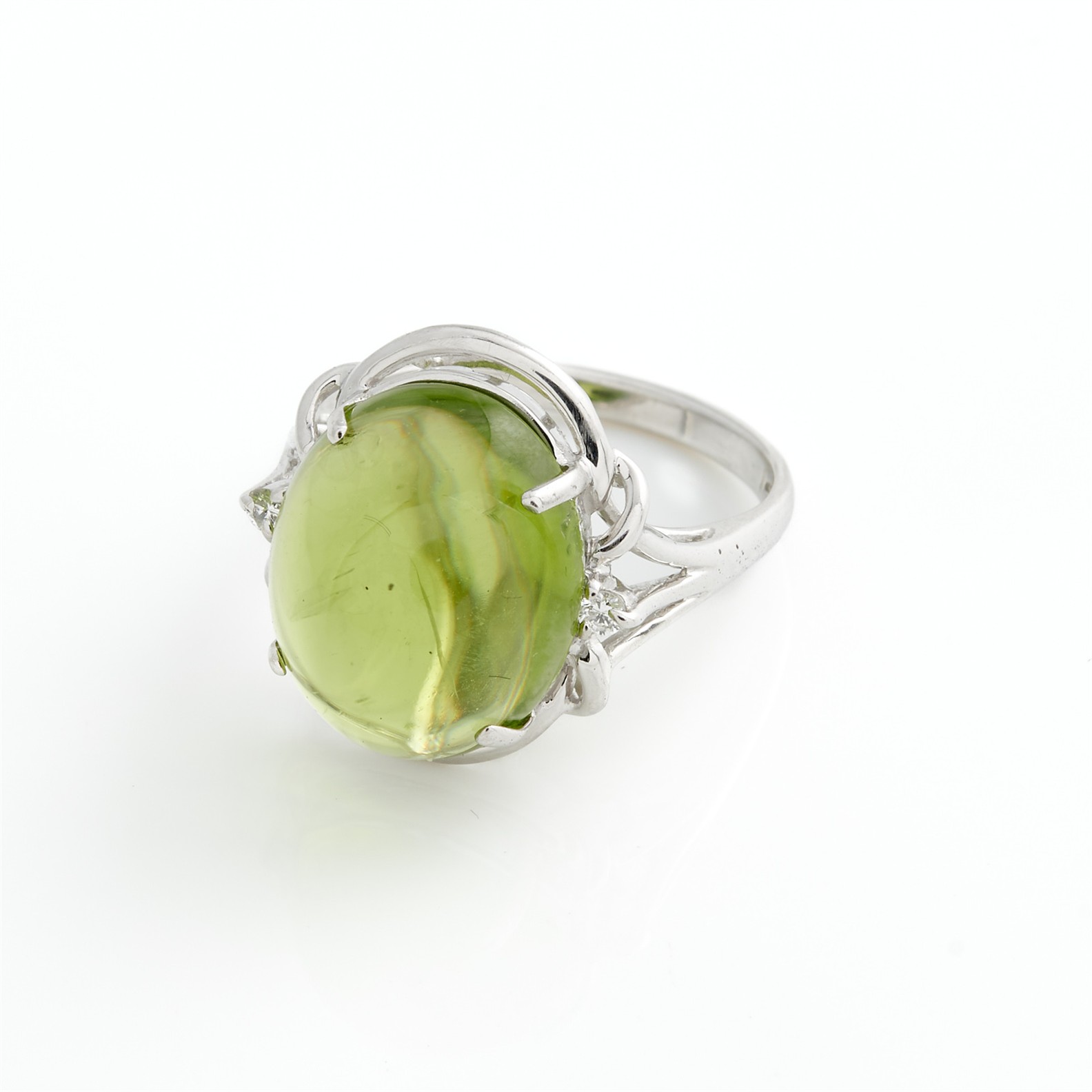 A PERIDOT AND DIAMOND RING IN 18CT WHITE GOLD, THE CABOCHON PERIDOT WEIGHING 10.85CTS, THE DIAMONDS TOTALLING 0.04CTS, SIZE O, 5.9GMS