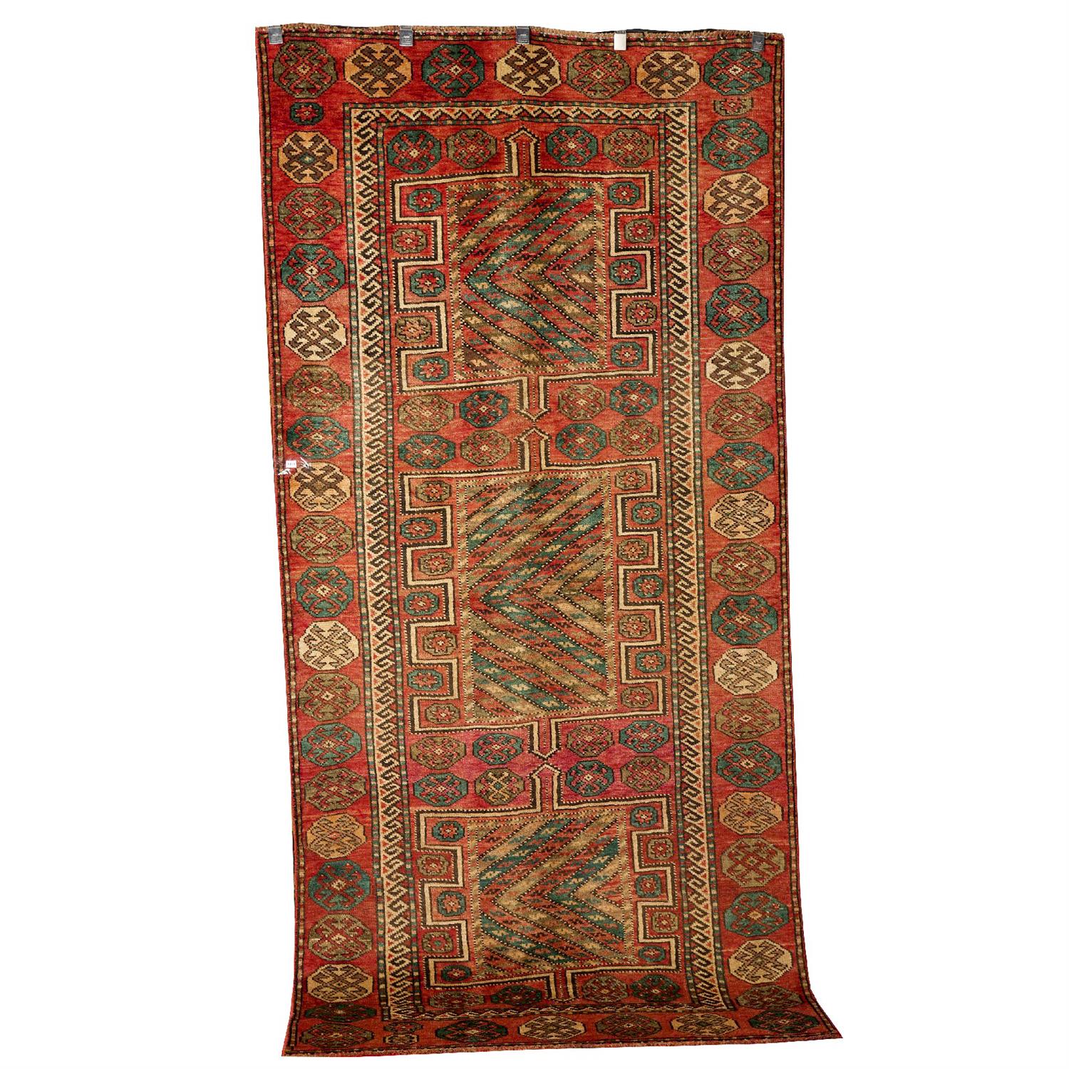 A TRIBAL PERSIAN HAMADAN AVAJ RUG, 100% HAND-SPUN WOOL PILE, NATURAL DYES, VILLAGE WEAVE WITH A TRIBAL DESIGN OF TRIPLE ANCHORED MEDALLIONS ON A RED FIELD OF ROSETTES. ORIGIN: PERSIA (287 X 139 CM) (LEONARD JOEL DELIVERY SIZE: LARGE)