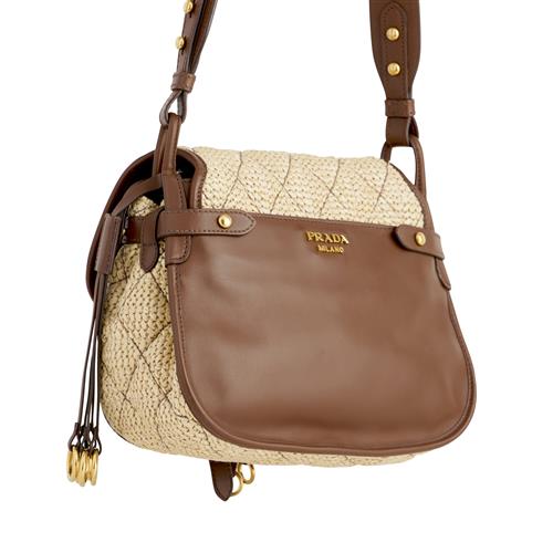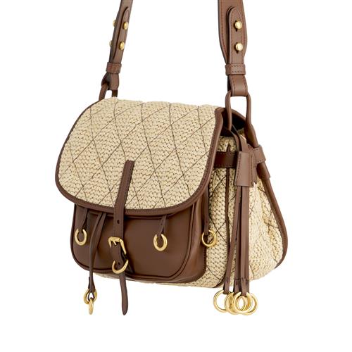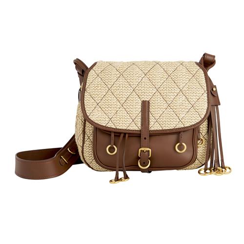 Styled in natural woven raffia with brown leather trim and gold tone hardware, featuring tassel detail, front flap and buckle closure, 22 x 24 x 11cm.
