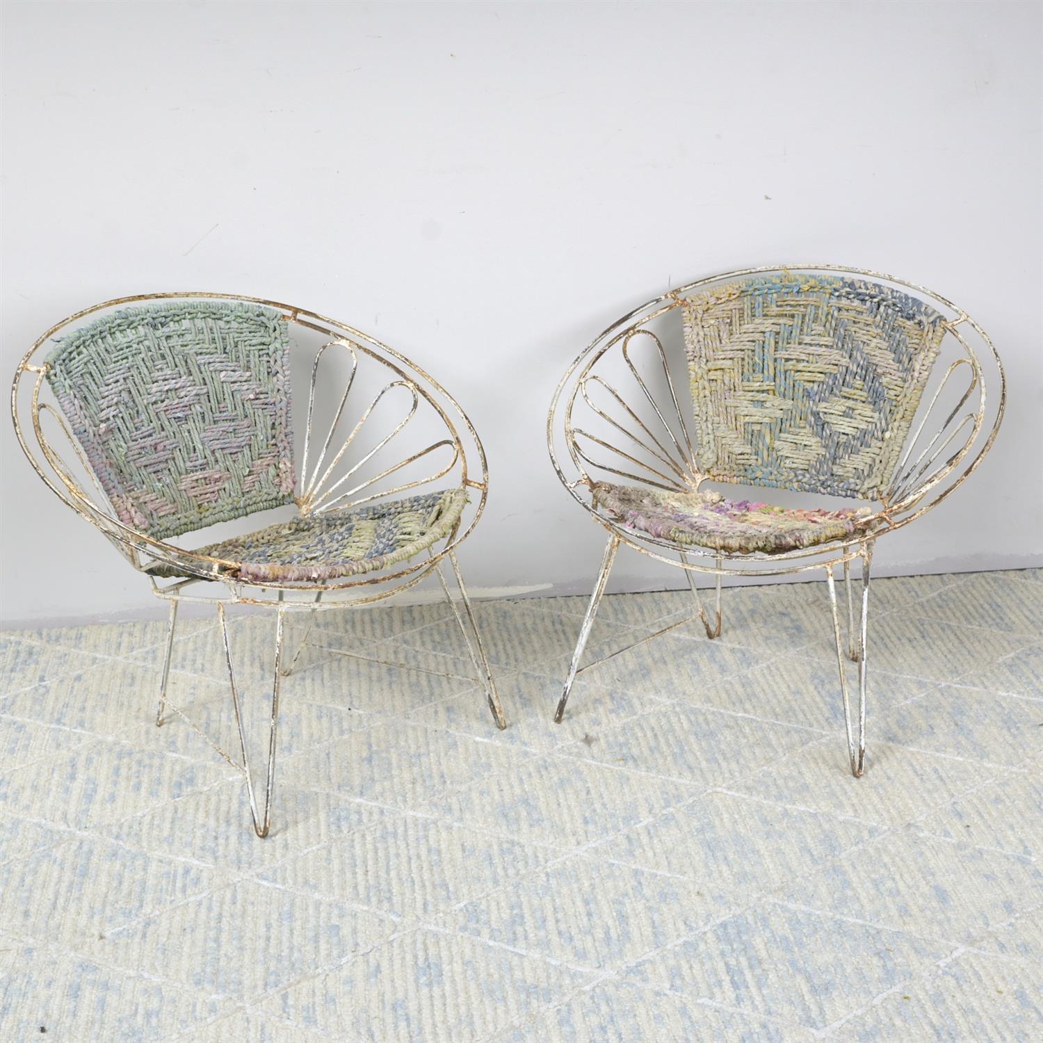 A PAIR OF 1950S, AUSTRALIAN WHITE WROUGHT IRON SAUCER CHAIRS WITH WOVEN SEATS (A/F) (62H X 71W X 59D CM) (LEONARD JOEL DELIVERY: LARGE)