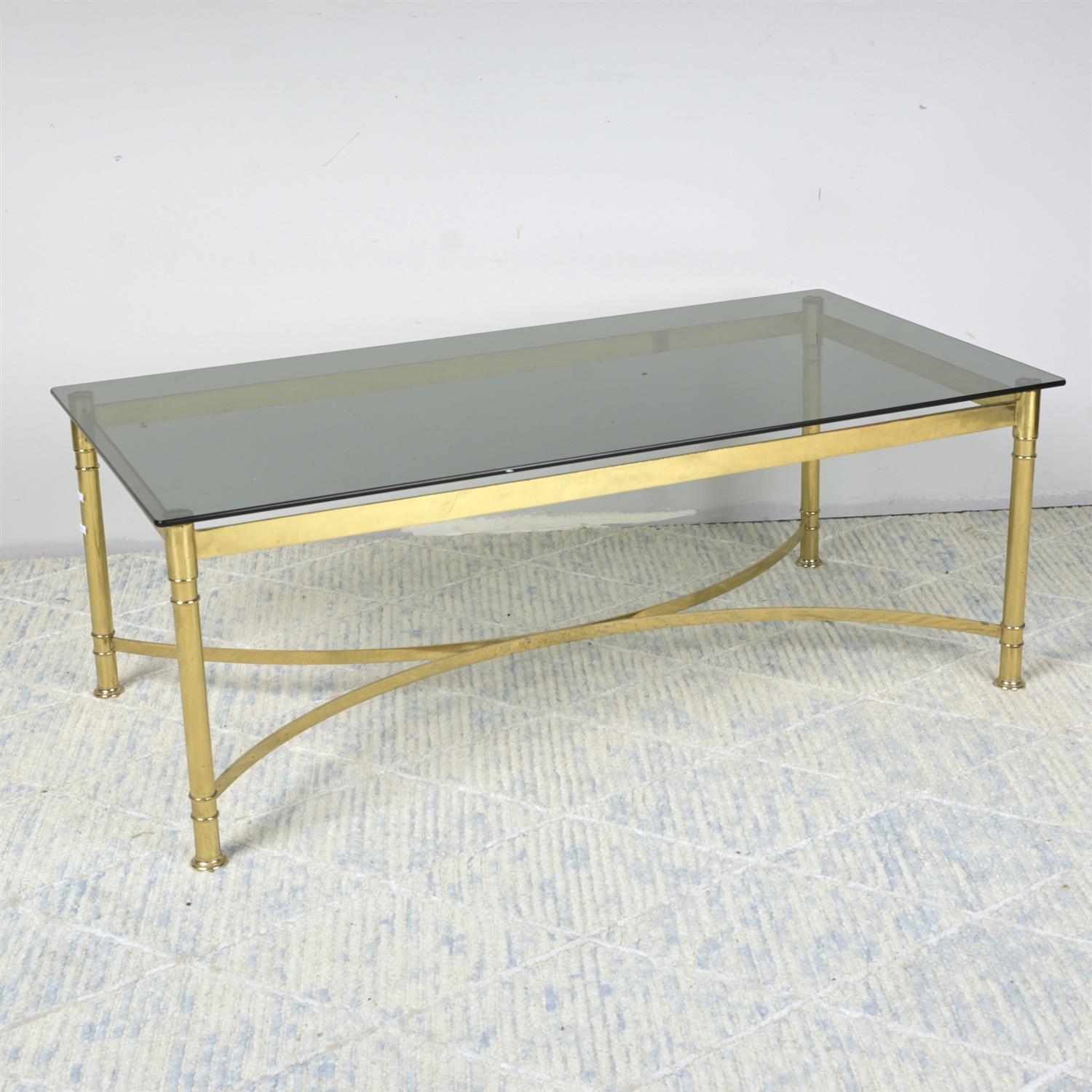 A BRASS AND SMOKED GLASS COFFEE TABLE (45H X 124W X 64D CM)  (LEONARD JOEL DELIVERY: X-LARGE)