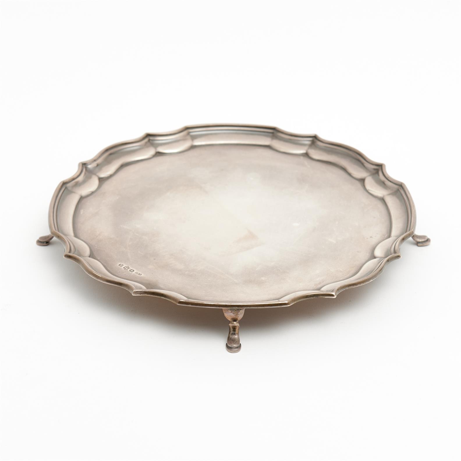 A STERLING SILVER SALVER ON THREE CLAW FEET AND A PIE CRUST BORDER 746G DIA.29.5CM, LEONARD JOEL DELIVERY SIZE: SMALL