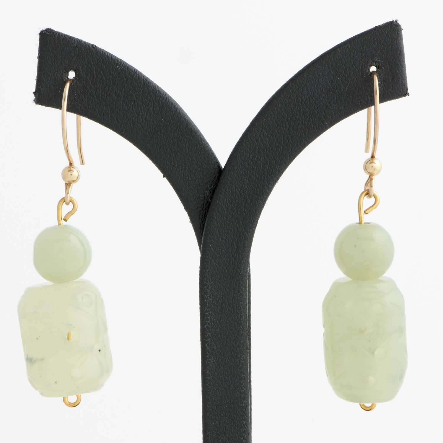 A PAIR OF CARVED JADE EARRINGS, TO SHEPHERD HOOK FITTINGS IN GOLD PLATE, 50MM