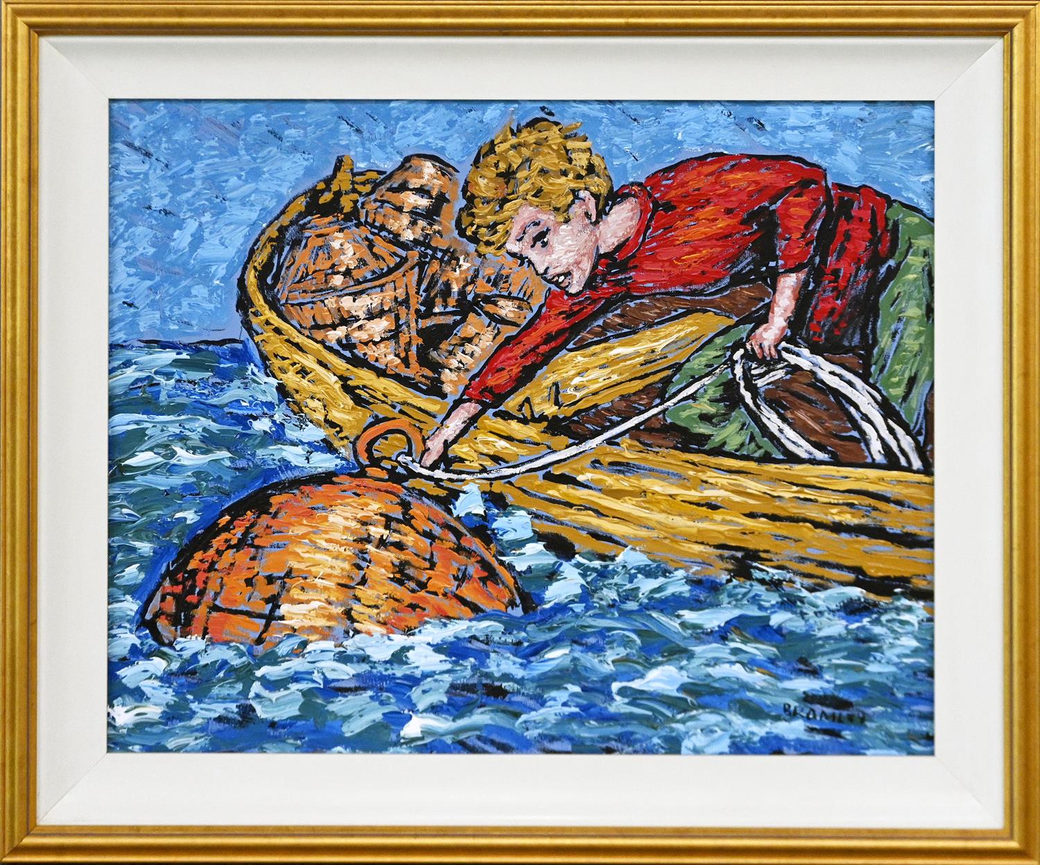 DAVID BROMLEY, GIRL MEETS BUOY, OIL ON CANVASBOARD, SIGNED LOWER RIGHT, 59.5 X 74CM, FRAME SIZE: 78 X 92.5CM