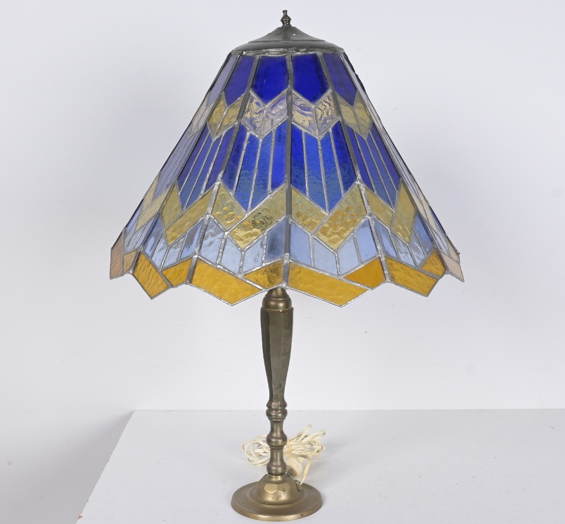 A LARGE BRASS AND STAINED GLASS TABLE LAMP (85H X 58DIA CM) (LEONARD JOEL DELIVERY: LARGE)