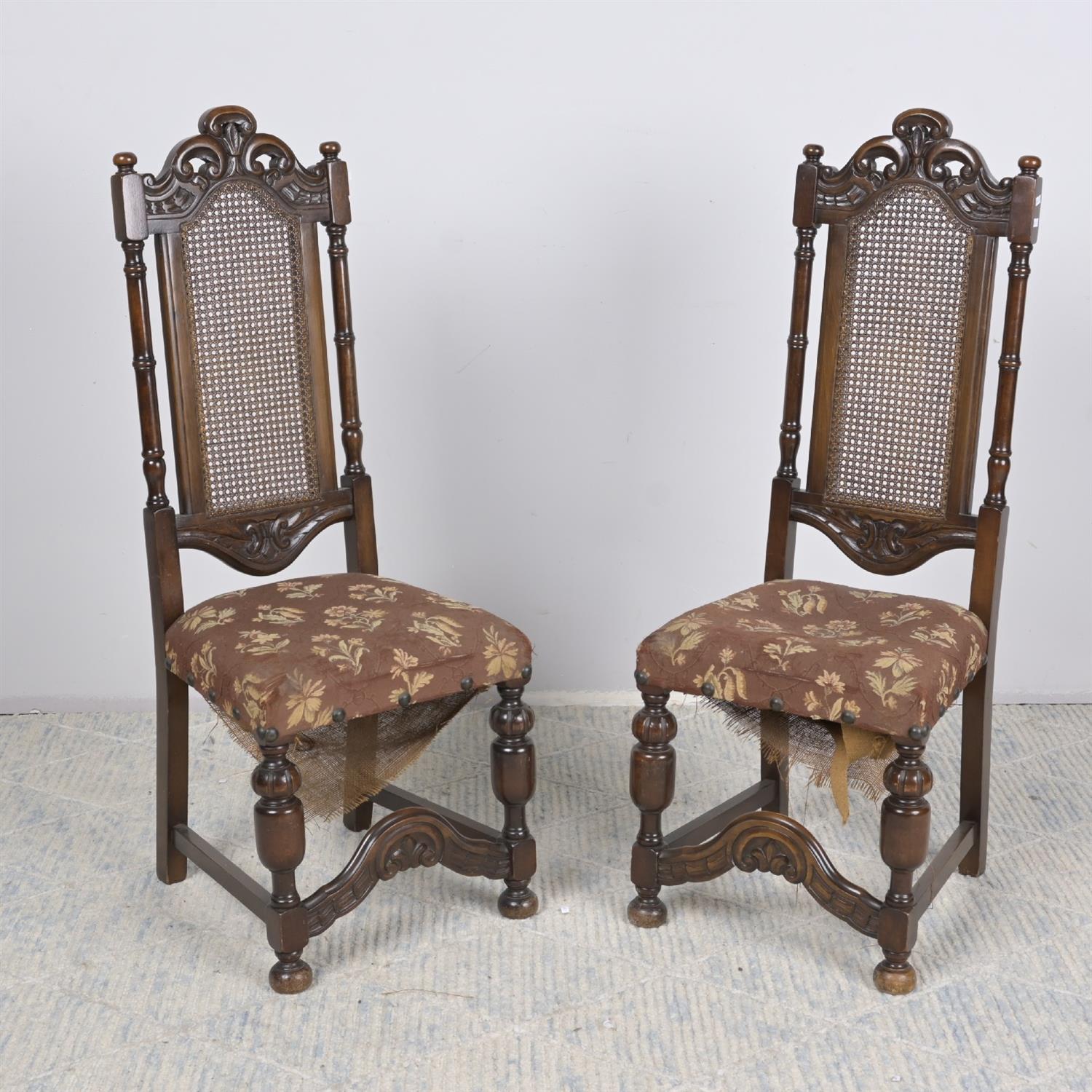 A PAIR OF CHARLES II-STYLE SIDE CHAIRS WITH CANED BACKS AND UPHOLSTERED SEATS, PURCHASED FROM GRACE ANTIQUES (127H X 44W X 47D CM) (LEONARD JOEL DELIVERY: LARGE)