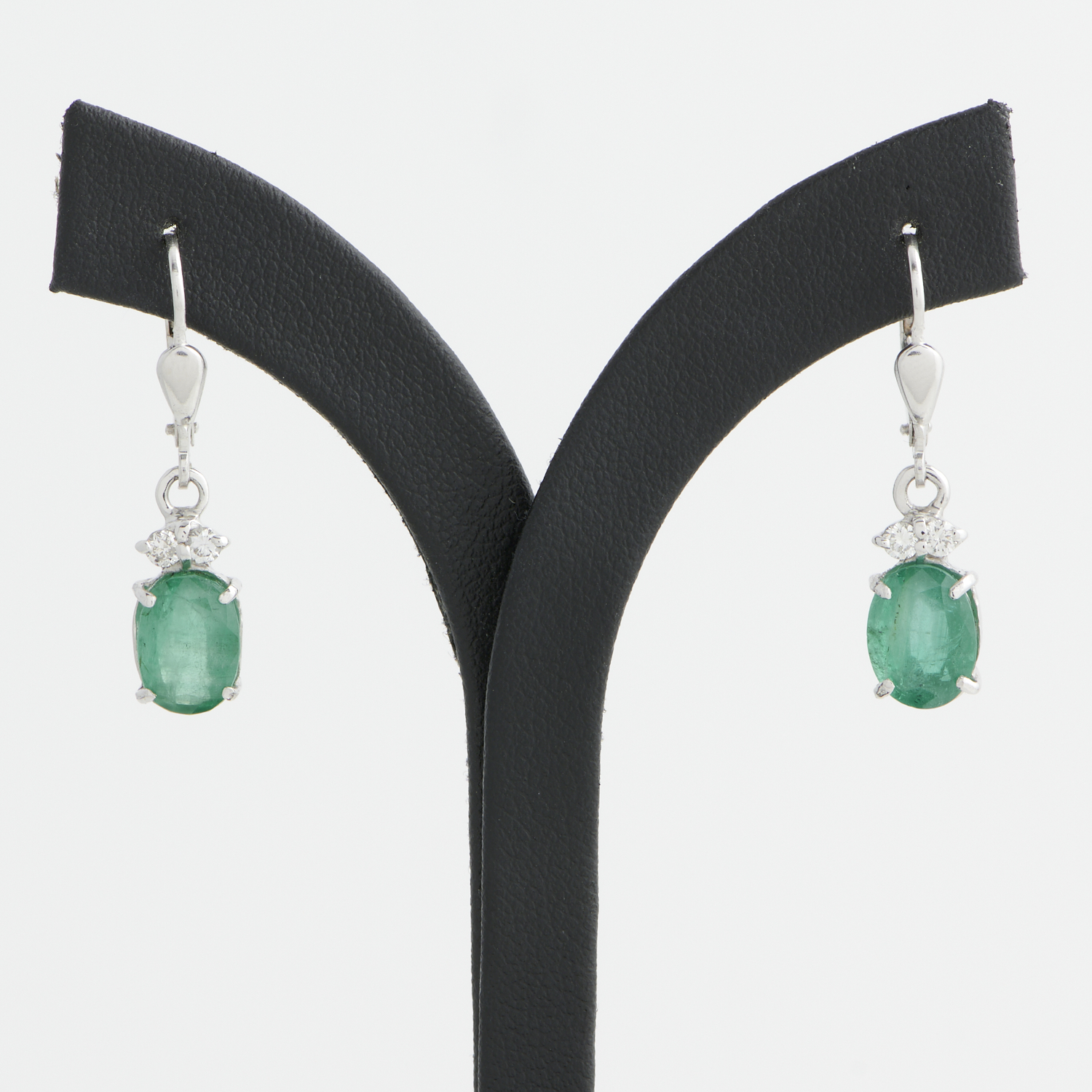 A PAIR OF EMERALD AND DIAMOND EARRINGS IN 8CT WHITE GOLD, THE EMERALDS TOTALLING 5.00CTS, THE DIAMONDS TOTALLING 0.30CTS (G/SI), TO EUROPEAN HOOK FITTINGS, LENGTH 30MM