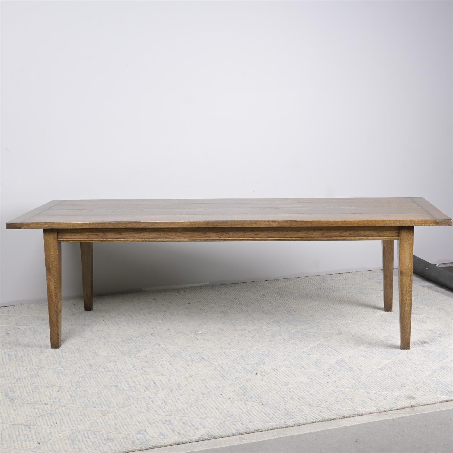 A FARMHOUSE STYLE OAK DINING TABLE (77H X 251W X 101D CM) (THIS HEAVY ITEM MUST BE REMOVED BY CARRIERS AT THE CUSTOMER'S EXPENSE. LEONARD JOEL STAFF CANNOT ASSIST CARRYING THIS ITEM)