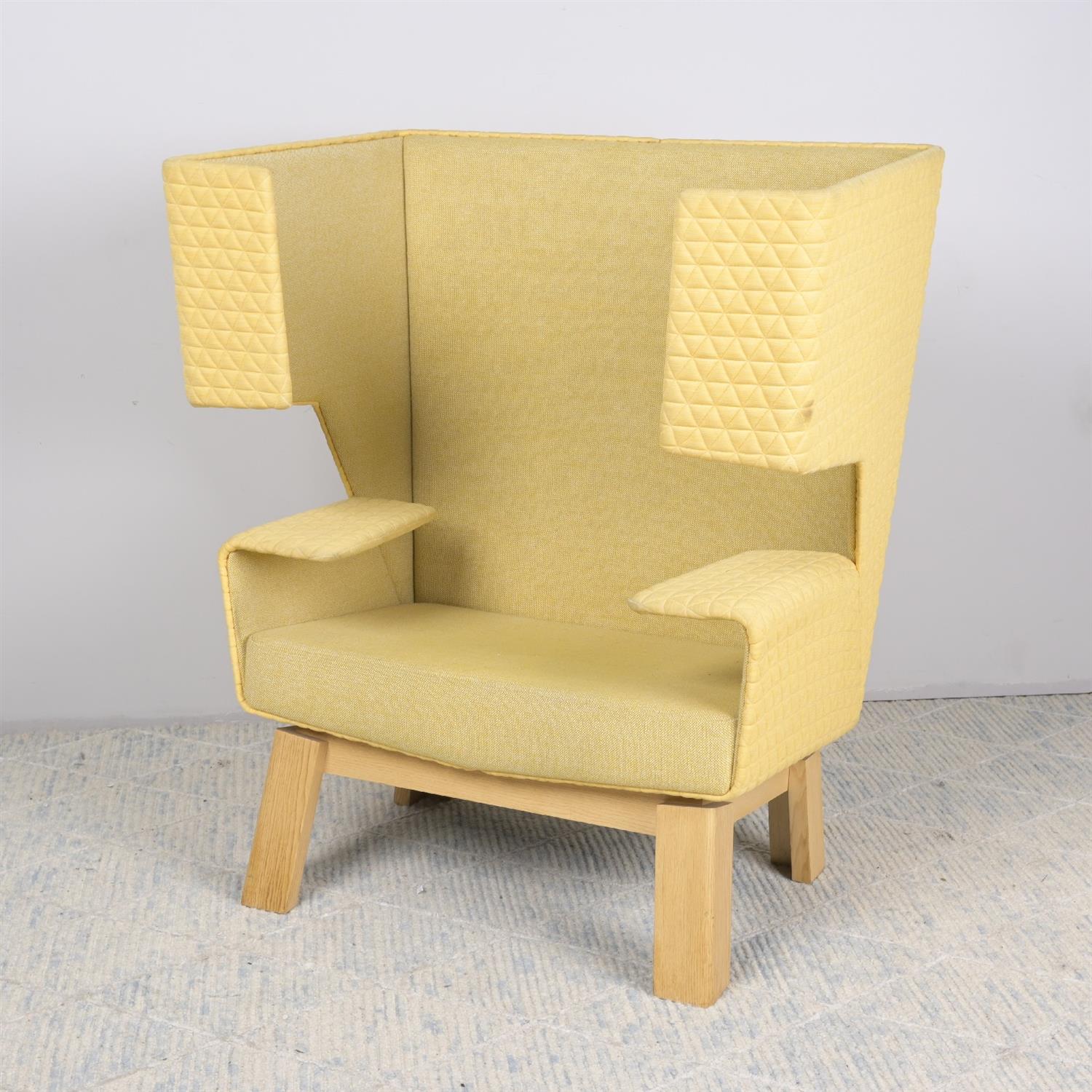 A MID-CENTURY UPHOLSTERED PRIVACY ARMCHAIR (A/F) (123H X 104W X 70D CM) (THIS HEAVY ITEM MUST BE REMOVED BY CARRIERS AT THE CUSTOMER'S EXPENSE. LEONARD JOEL STAFF CANNOT ASSIST CARRYING THIS ITEM)