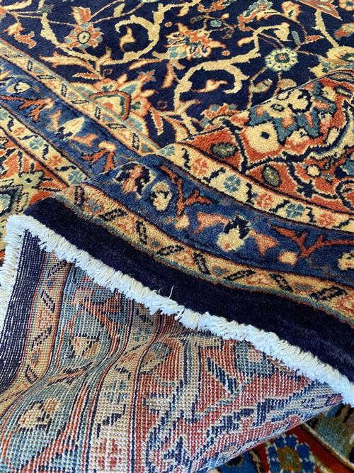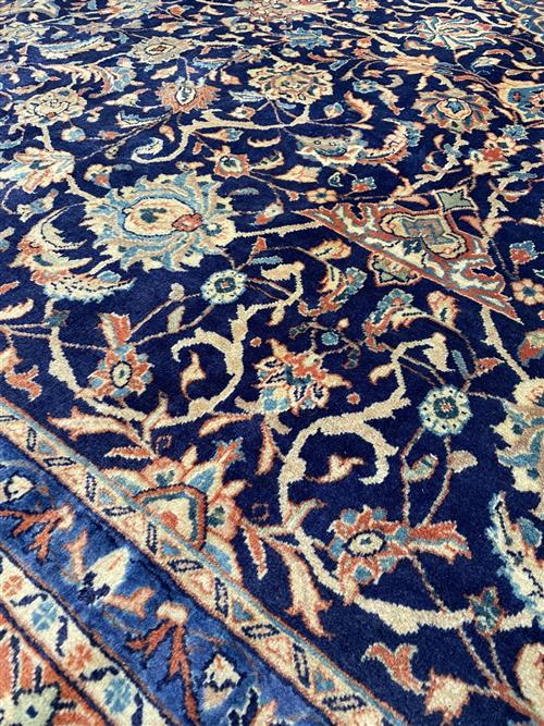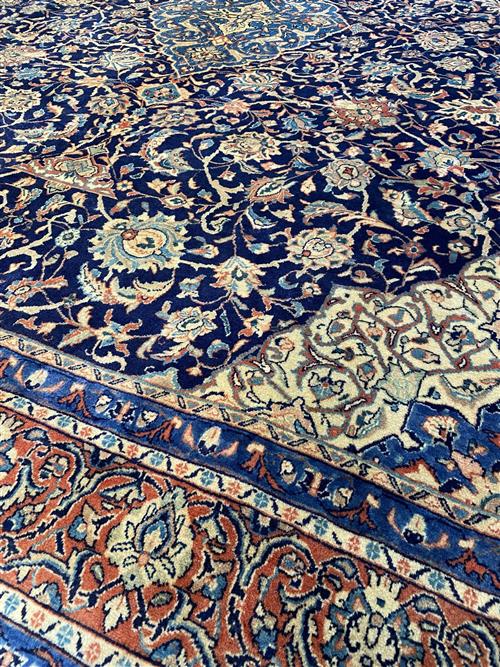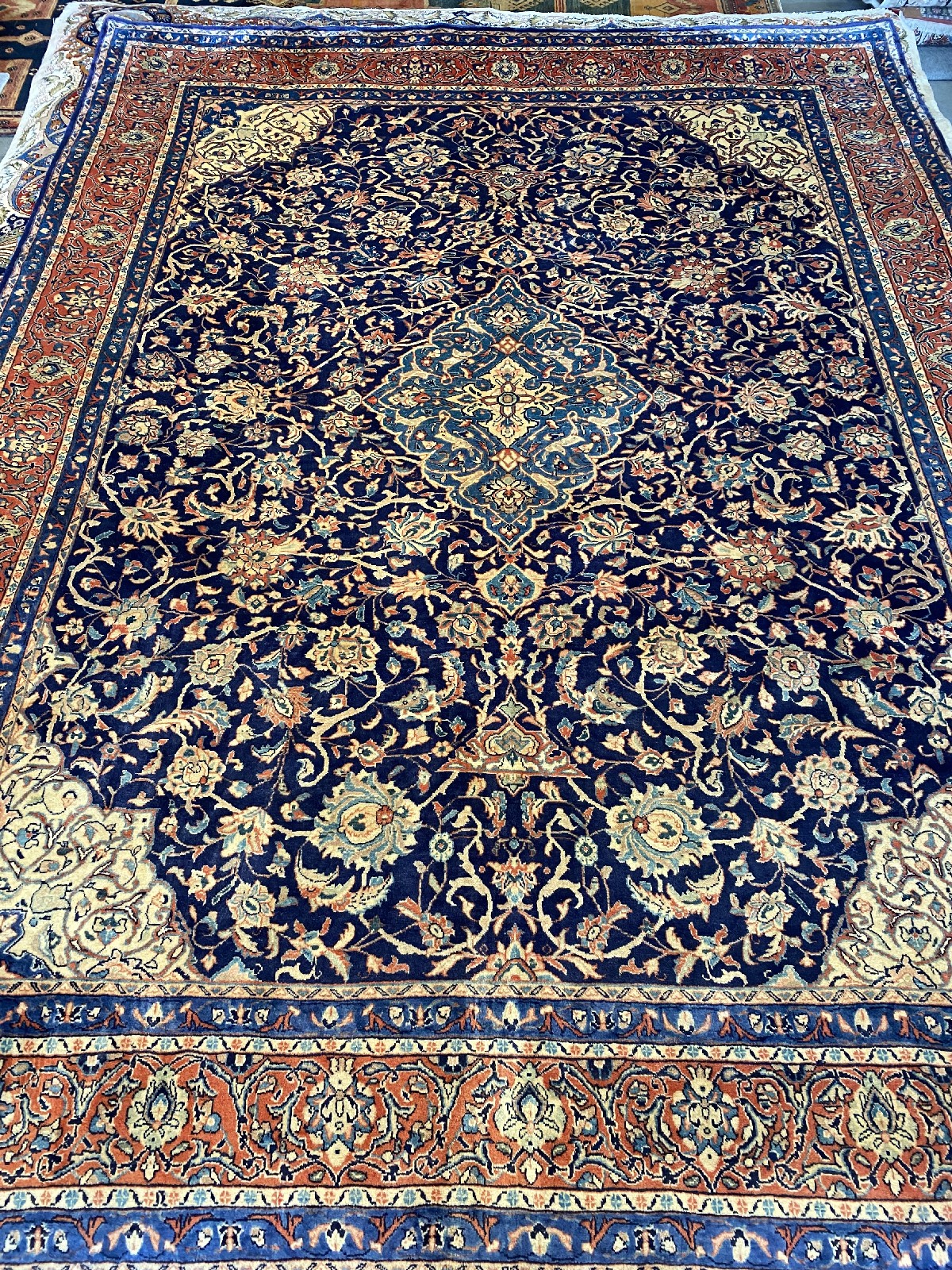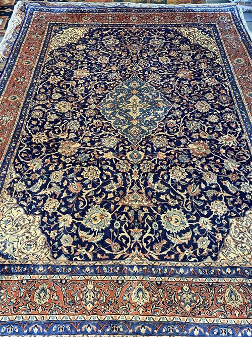 A PERSIAN SAROUQ CARPET, 100% WOOL, DENSE PLUSH PILE, IN GALLERY CONDITION. HAND-KNOTTED WITH TRADITIONAL DESIGN OF AN ELONGATED MEDALLION IN FRENCH BLUE AND IVORY ON A ROYAL BLUE FIELD, WITH ESLIMI SCROLLS, SAZ LEAVES, AND LARGE PALMETTES IN TONES OF RUST, COGNAC, FRENCH BLUE, THE MAJOR BORDER IN RED OF PALMETTES AND FLORAL MOTIFS. ORIGIN: PERSIA (365 X 279 CM) ANTI-SLIP UNDERLAY INCLUDED (LEONARD JOEL DELIVERY SIZE: X-LARGE)