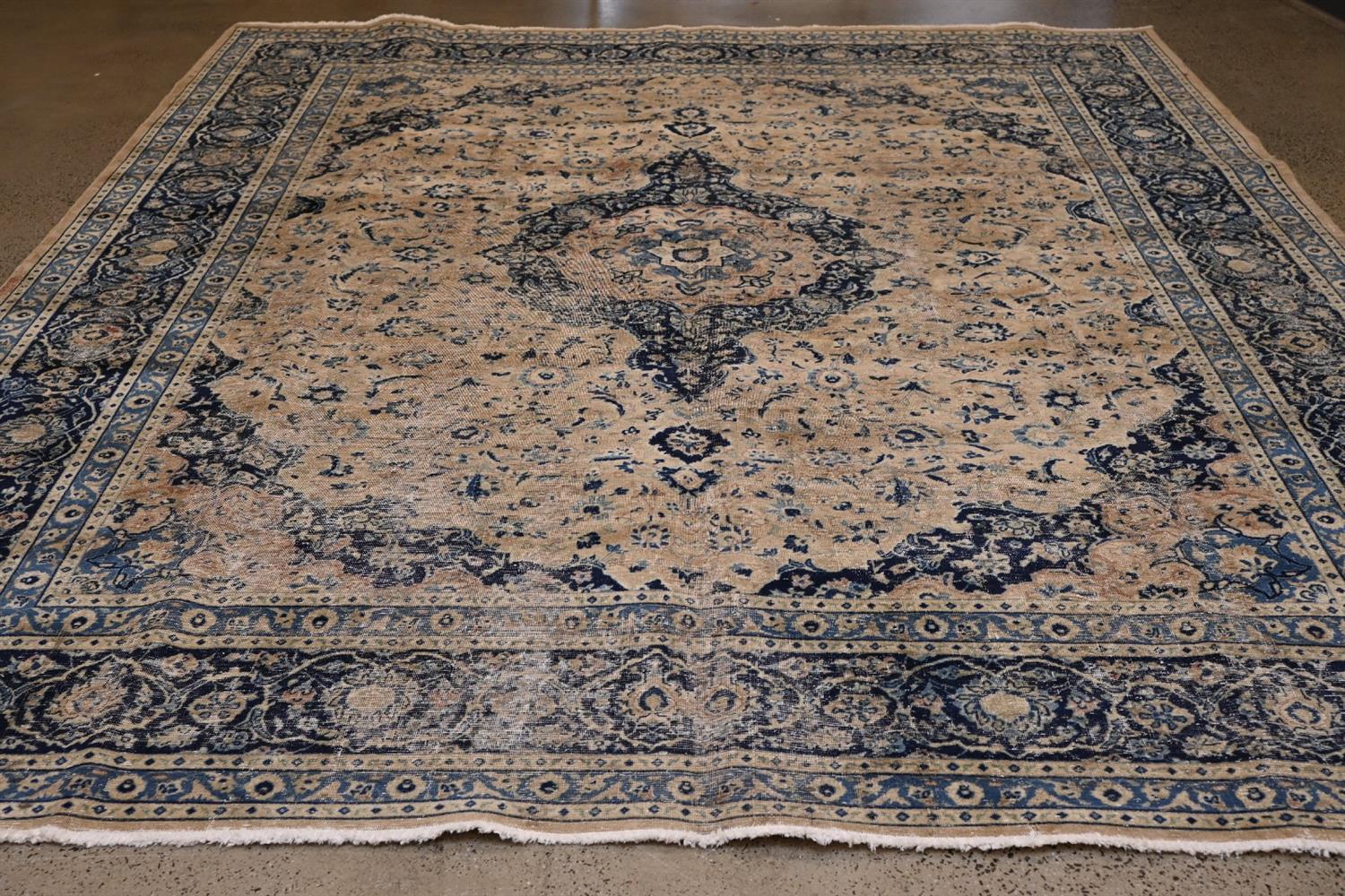 AN OVER-DYED PERSIAN SABZEVAR CARPET. 100% WOOL, HAND-KNOTTED. CLASSIC PERSIAN DESIGN OF CENTRAL FLORAL ELONGATED MEDALLION WITH ALL OVER FLORAL DETAIL. IN TONES OF ROYAL BLUE, TAN WITH A HINT OF RUST AND SAGE GREEN. ORIGIN: IRAN. ANTI-SLIP UNDERLAY INCLUDED (379 X 300 CM) (LEONARD JOEL DELIVERY SIZE: X-LARGE)