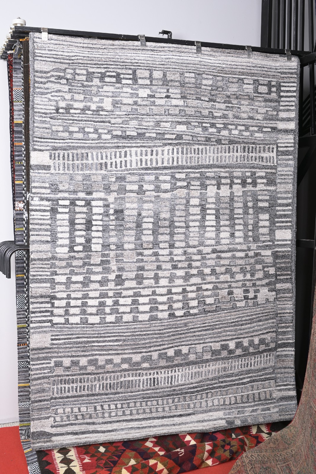 A NEW MODERN ABSTRACT EMBOSSED DESIGN RUG. HAND-MADE LOOM, 100% WOOL IN GREY, IVORY, AND CHARCOAL TONES. ORIGIN: INDIA (171 X 239 CM) (LEONARD JOEL DELIVERY SIZE: LARGE)
