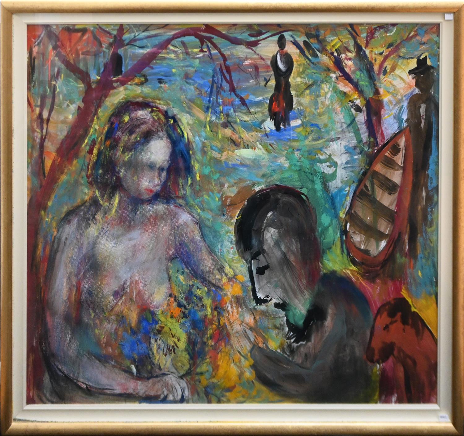 § JAMIE BOYD, (FIGURES IN LANDSCAPE), MIXED MEDIA ON PAPER, SIGNED LOWER RIGHT, 104 X 118CM, FRAME SIZE: 117 X 132CM