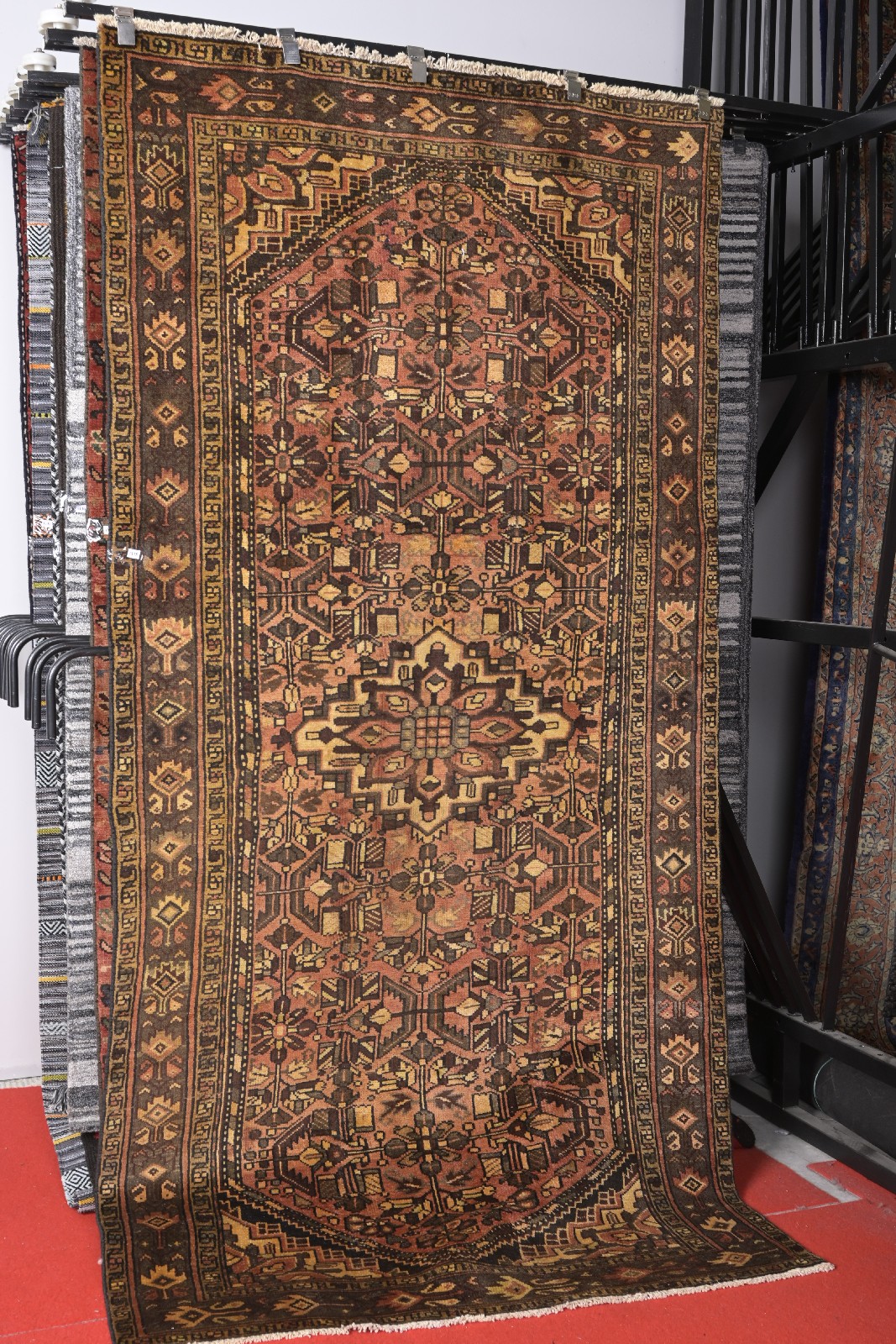 A 1970s PERSIAN CHESHMEH RUG, 100% WOOL, ORGANIC DYES, HAND-KNOTTED WEAVE FROM THE HAMADAN PROVINCE, WITH AN ALL-OVER TRIBAL PATTERNED DESIGN ON A SOFT RED FIELD, WITH COLOUR TONES OF AUBERGINE, GOLD, AND TAN. CLEAN GALLERY CONDITION. ORIGIN: PERSIA (290 X 150 CM) (LEONARD JOEL DELIVERY SIZE: X-LARGE)