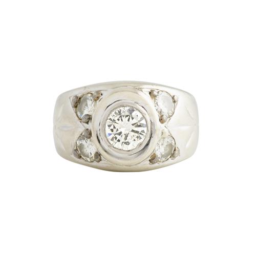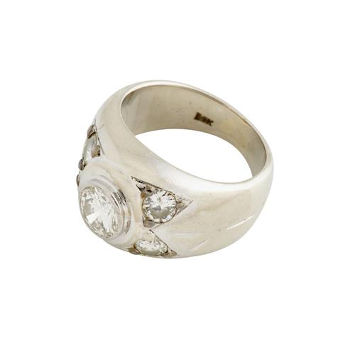 A DIAMOND RING IN 12CT WHITE GOLD, THE CENTRAL DIAMOND WEIGHING APPROXIMATELY 0.70CTS, THE SURROUNDING DIAMONDS TOTALLING APPROXIMATELY 0.60CTS, SIZE N1/2, 10.7GMS