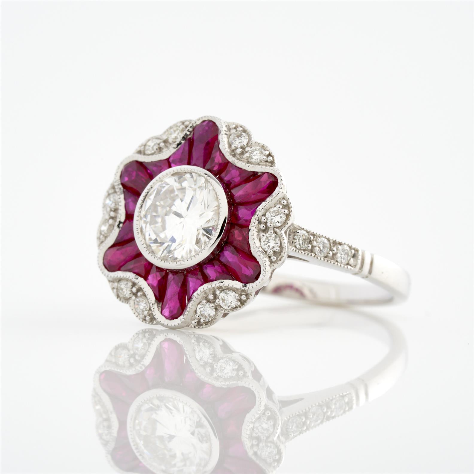 A RUBY AND DIAMOND RING IN 18CT WHITE GOLD, THE CENTRAL DIAMOND WEIGHING 1.00CTS, THE RUBY TOTALLING 1.54CTS, AND OTHER DIAMONDS TOTALLING 0.25CTS, ACCOMPANIED BY A VALUATION