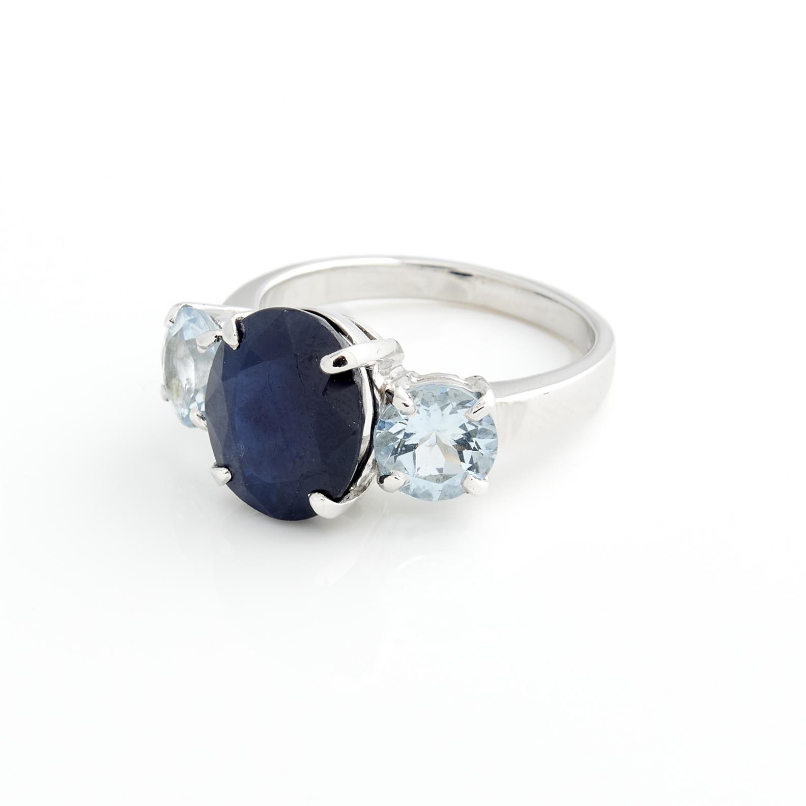 A SAPPHIRE, AQUAMARINE AND DIAMOND RING IN 18CT WHITE GOLD, THE SAPPHIRE WEIGHING 5.32CTS WITH AQUAMARINE WEIGHING 1.50CTS, SIZE M 1/2, ACCOMPANIED BY A VALUATION