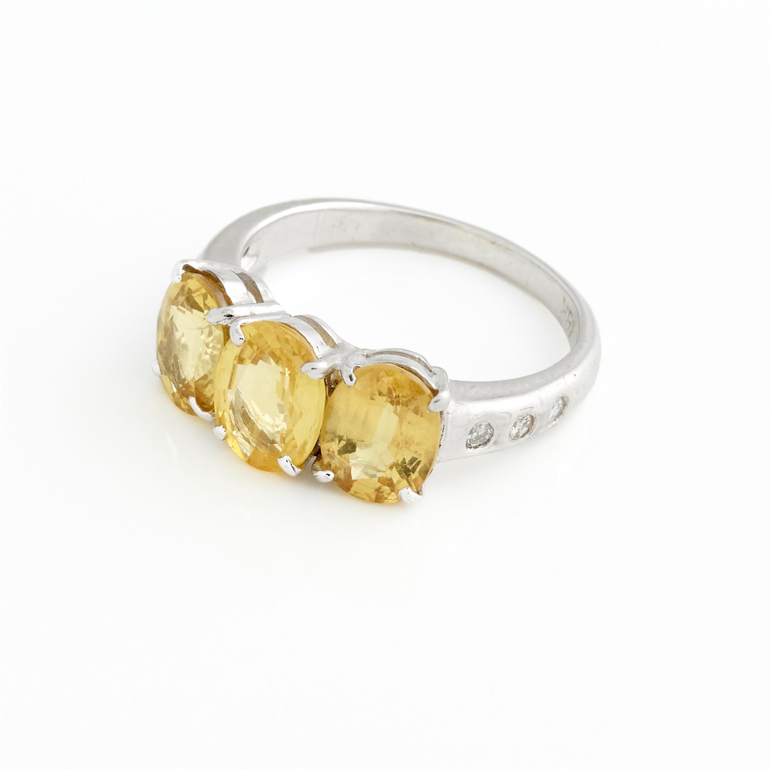 A THREE STONE SAPPHIRE AND DIAMOND RING IN 18CT WHITE GOLD, SIZE M