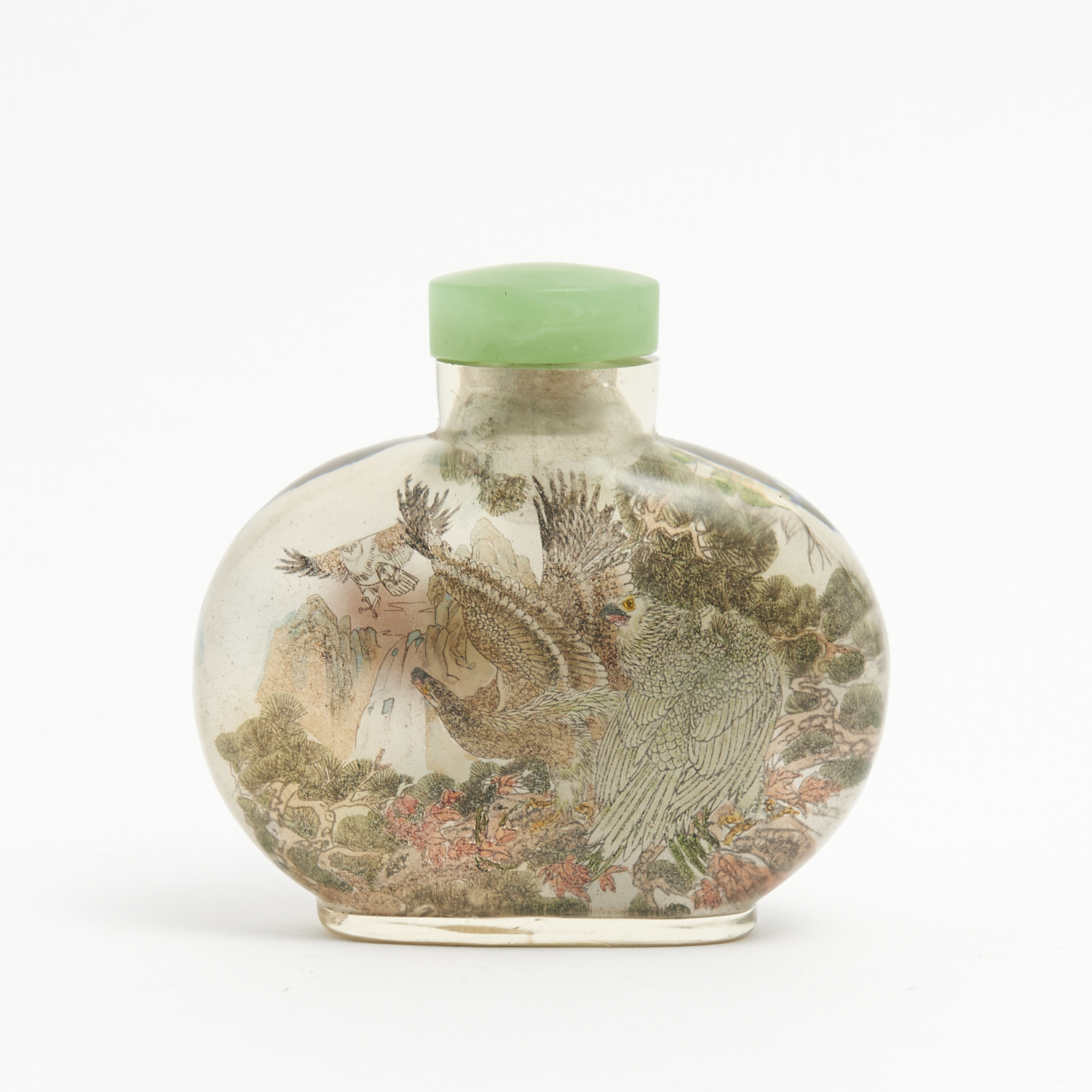 A CHINESE REVERSE PAINTED SNUFF BOTTLE DECORATED WITH EAGLES AND PEACOCKS WITH LANDSCAPE AND FLOWERS H.10CM, LEONARD JOEL DELIVERY SIZE: SMALL