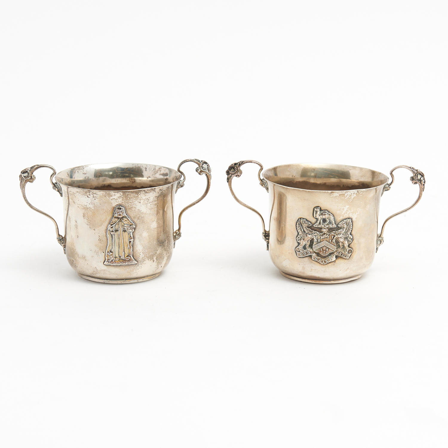 A PAIR OF STERLING SILVER PORRINGERS, EACH BEARING THE WORSHIPFUL COMPANY OF GROCERS COAT OF ARMS, JOHNSON, WALKER & TOLHURST LTD, LONDON, 1899 H.6.5CM W.222G, LEONARD JOEL DELIVERY SIZE: SMALL