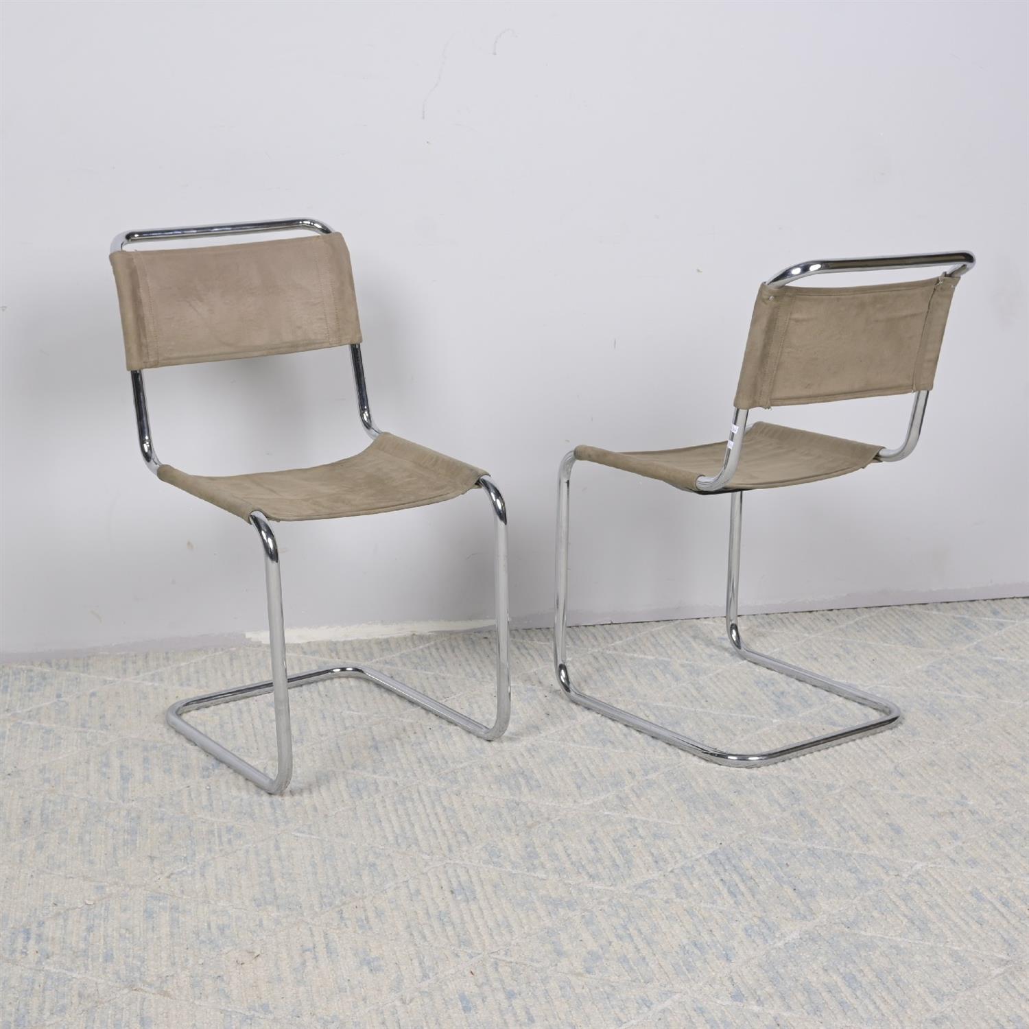 A PAIR OF 1940'S CHROME AND SUEDE CANTILEVER SIDE CHAIRS (84H X 44W X 50D CM) (LEONARD JOEL DELIVERY: LARGE)