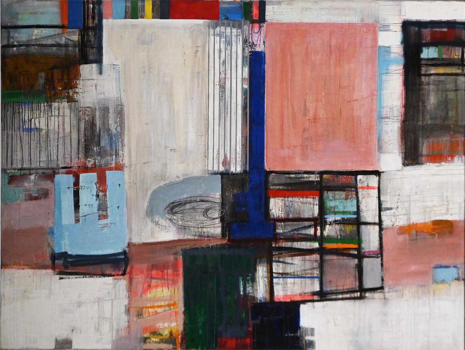 § MORTEN LASSEN, SURROUNDED O 2014, OIL AND SPRAY ON LINEN, SIGNED AND DATED VERSO, 152 X 200CM