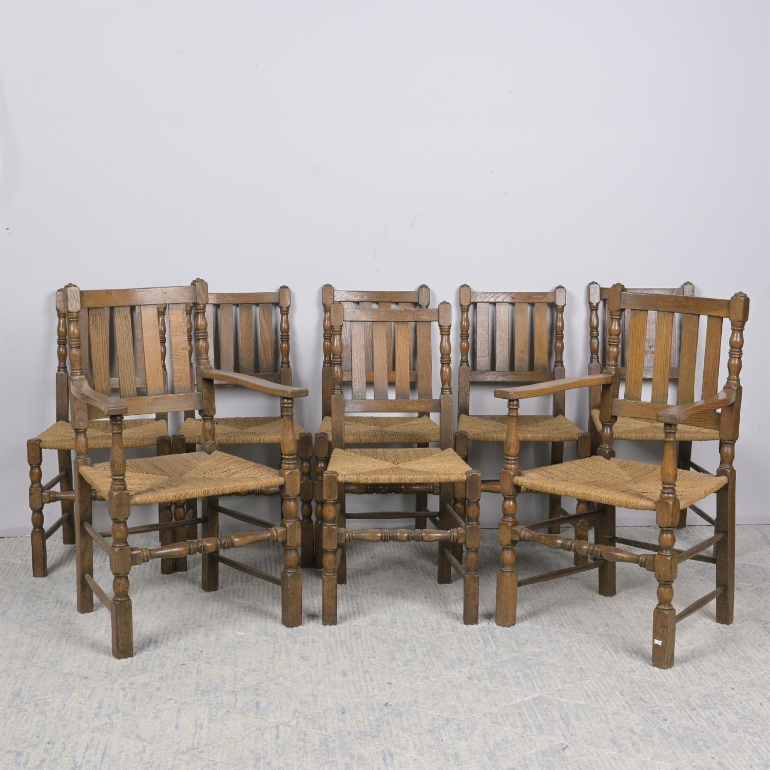 A SET OF EIGHT OAK DINING CHAIRS WITH SEAGRASS SEATS, INCLUDING TWO CARVERS (98H X 62W X 49D CM) (LEONARD JOEL DELIVERY: X-LARGE)