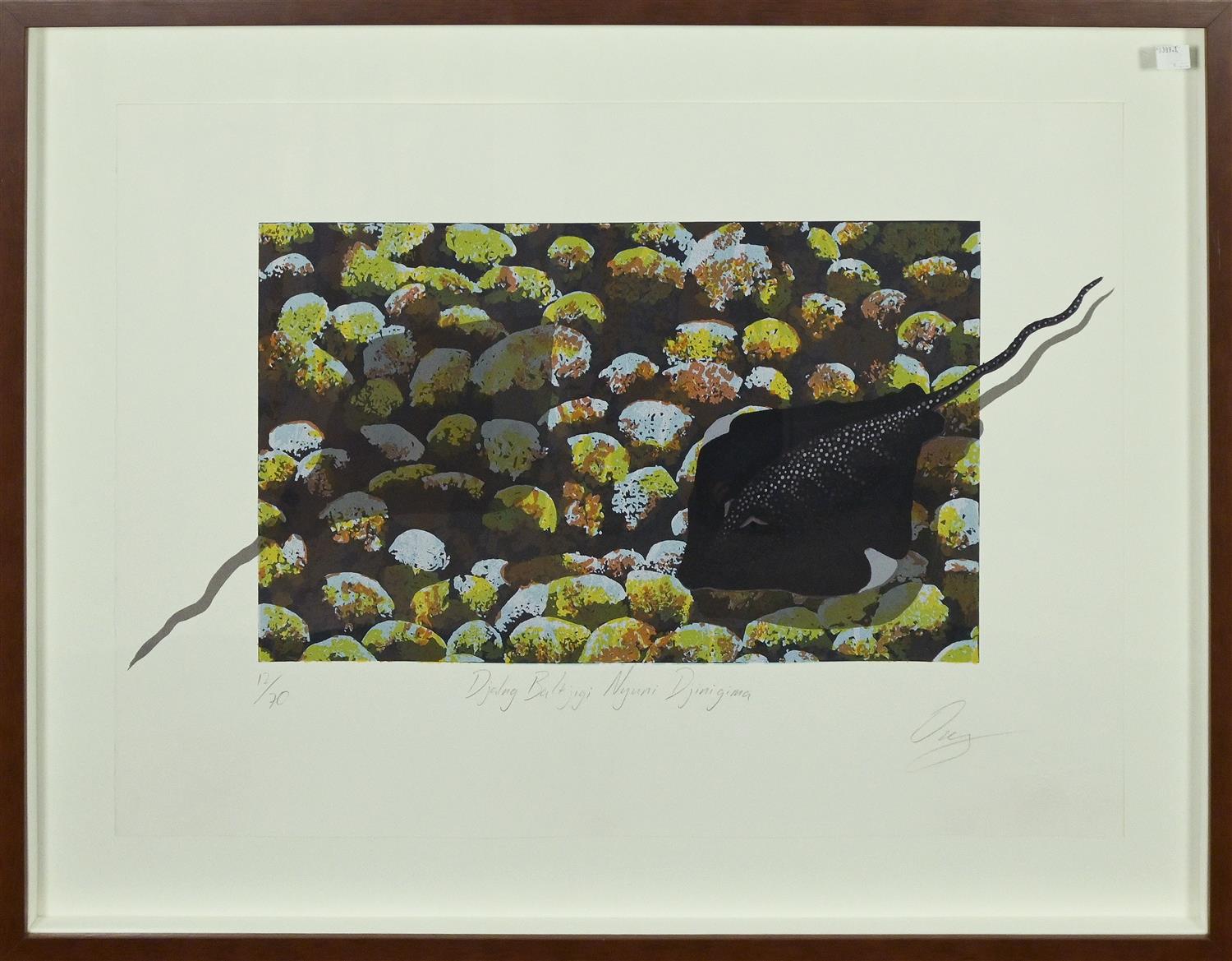 LIN AND TIRIKI ONUS, DJALNG BALTJIGI NGUKI DJINIGMA (WISH YOU WERE HERE), SCREENPRINT ED. 12/70, SIGNED BY TIRIKI ONUS LOWER RIGHT, TITLED AND EDITIONED BELOW IMAGE, 30 X 50CM, FRAME SIZE: 66 X 86CM