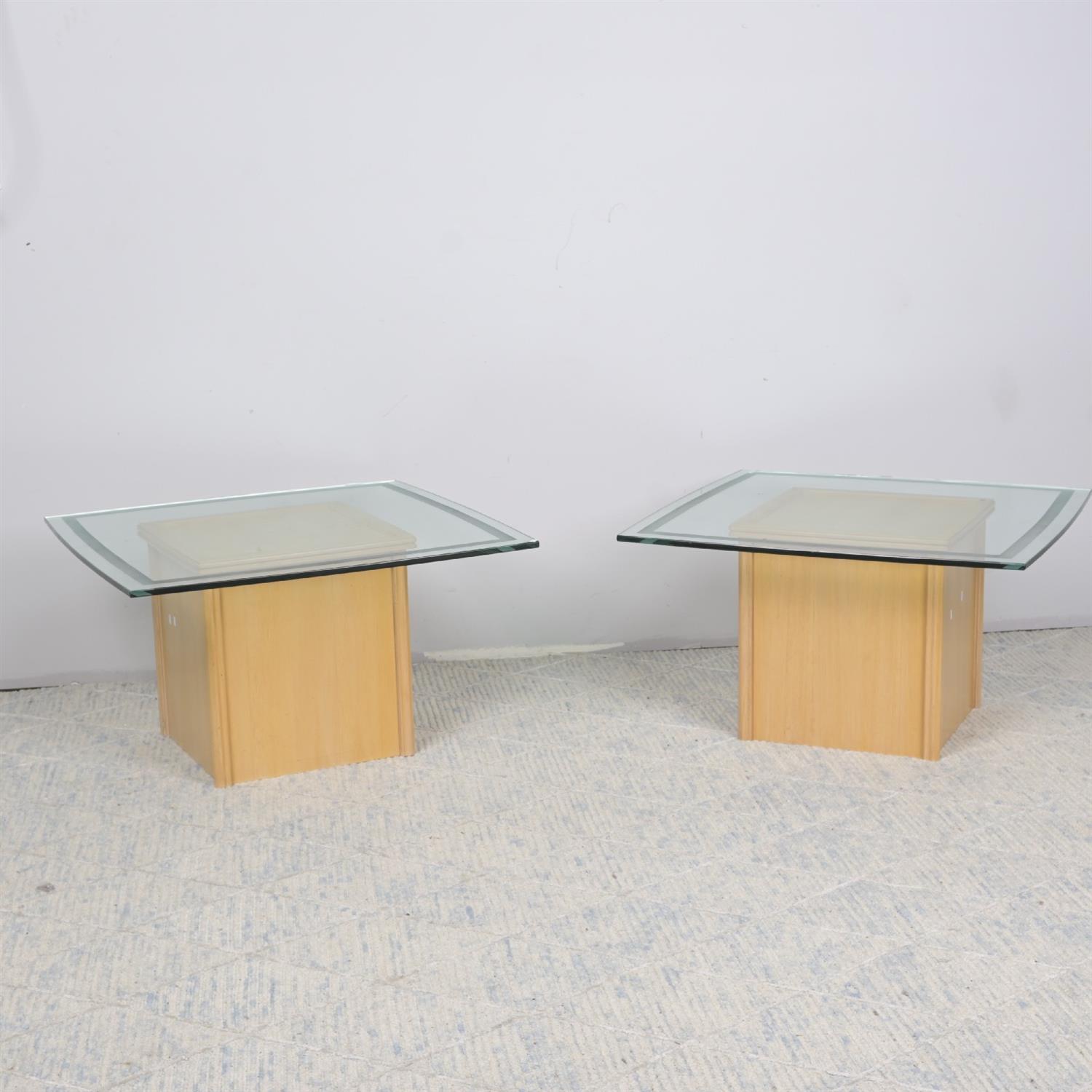 A PAIR OF CONTEMPORARY GLASS TOP SIDE TABLES (51H X 92W X 92D CM) (THIS HEAVY ITEM MUST BE REMOVED BY CARRIERS AT THE CUSTOMER'S EXPENSE. LEONARD JOEL STAFF CANNOT ASSIST CARRYING THIS ITEM)