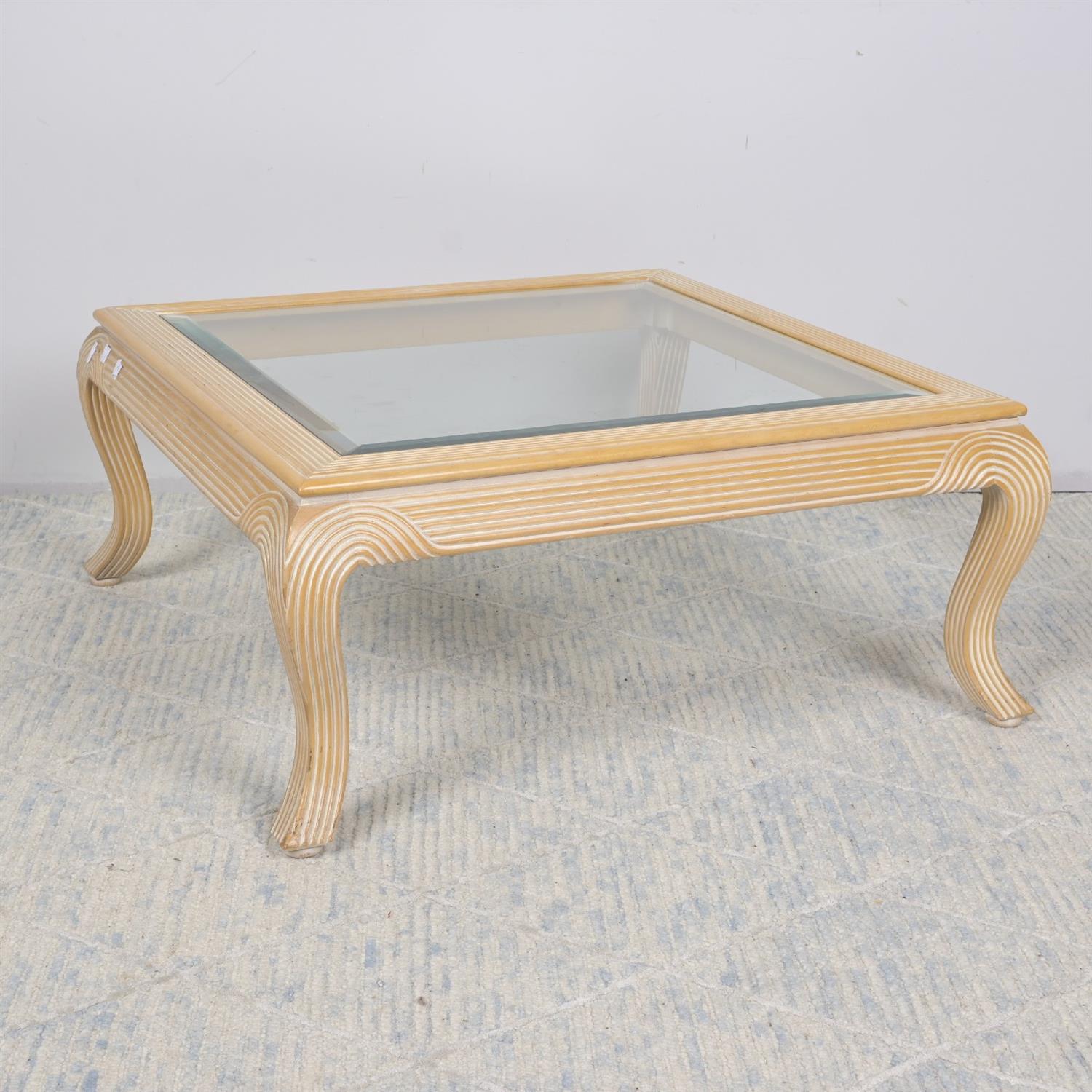AN ITALIAN PICKLED BEACH WOOD AND GLASS INSET SQUARE COFFEE TABLE ON CABRIOLE LEGS (43HX 93W X 93D CM) (LEONARD JOEL DELIVERY: X-LARGE)