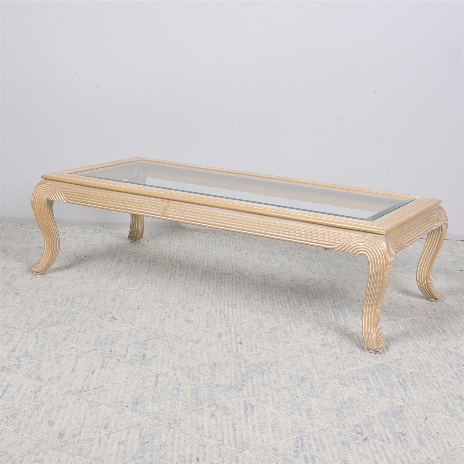 AN ITALIAN PICKLED BEACH WOOD AND GLASS INSET COFFEE TABLE ON CABRIOLE LEGS (42H X 143W X 67D CM) (LEONARD JOEL DELIVERY: X-LAREG)