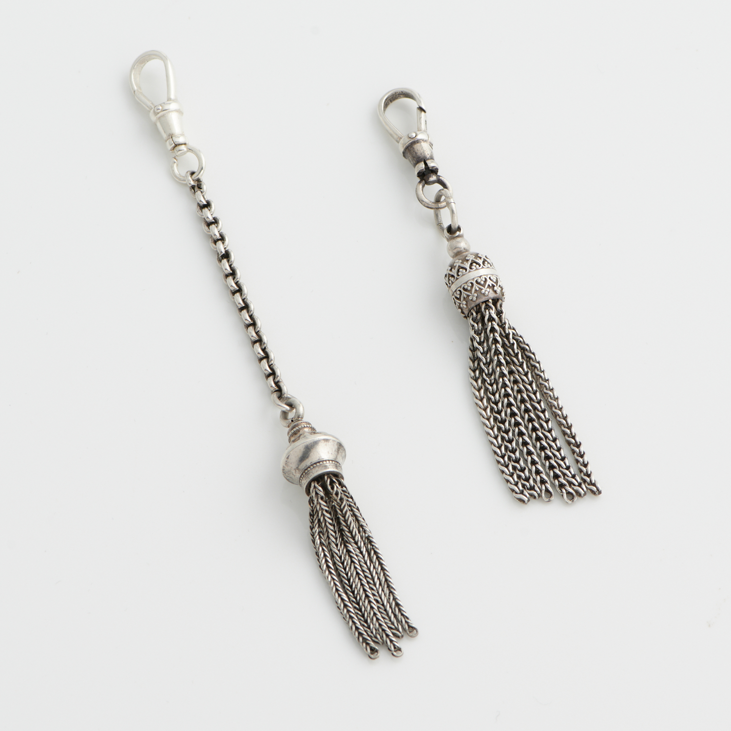 TWO TASSEL CHARMS IN BASE METAL TO DOG CLIP FITTINGS, 7.5MM AND 11MM