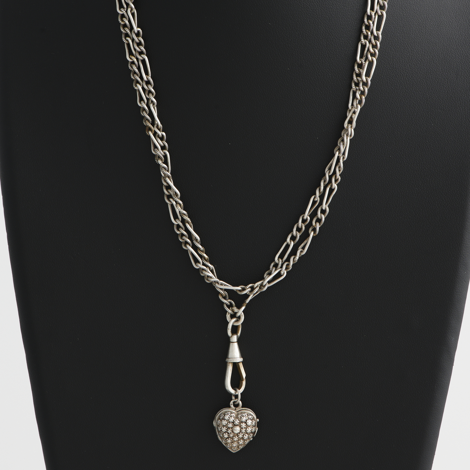 A GUARD CHAIN IN SILVER, WITH HEART SHAPED LOCKET, 1360MM