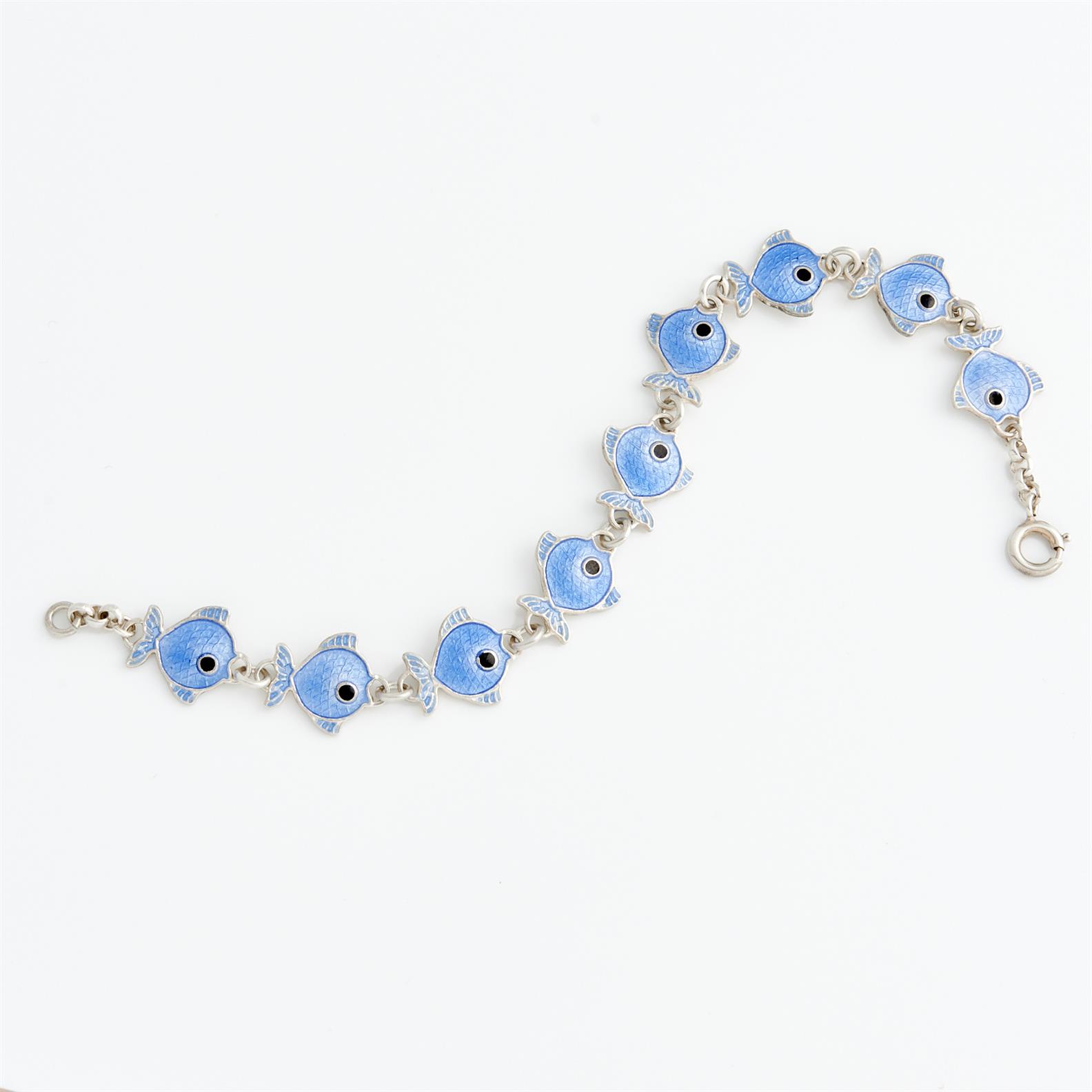 AN ENAMELLED FISH MOTIF BRACELET IN STERLING SILVER, TO AN OVAL CLASP, 180MM
