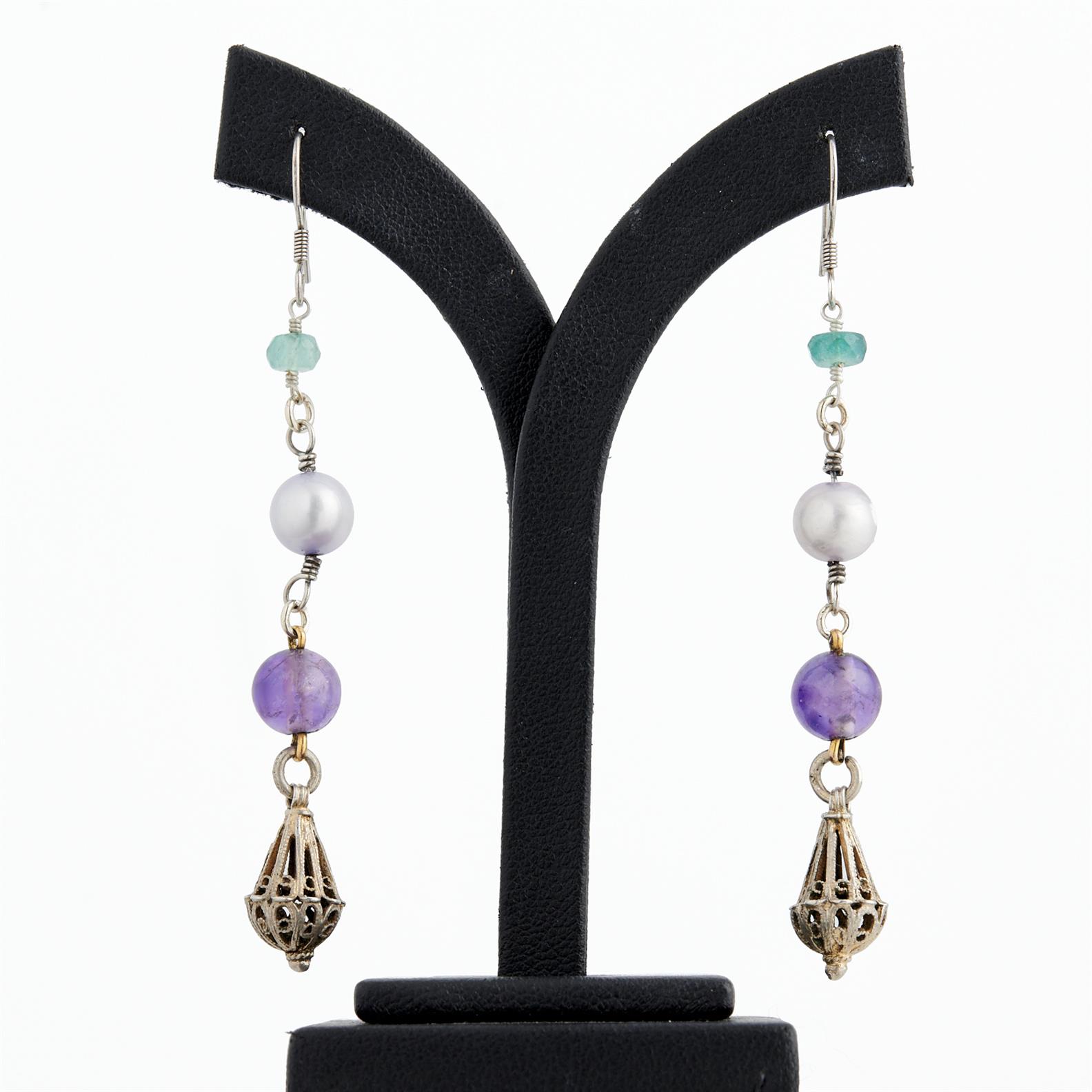 A PAIR OF AMETHYST AND PEARL DROP EARRINGS IN SILVER, TO SHEPHERD HOOK FITTINGS, LENGTH 70MM