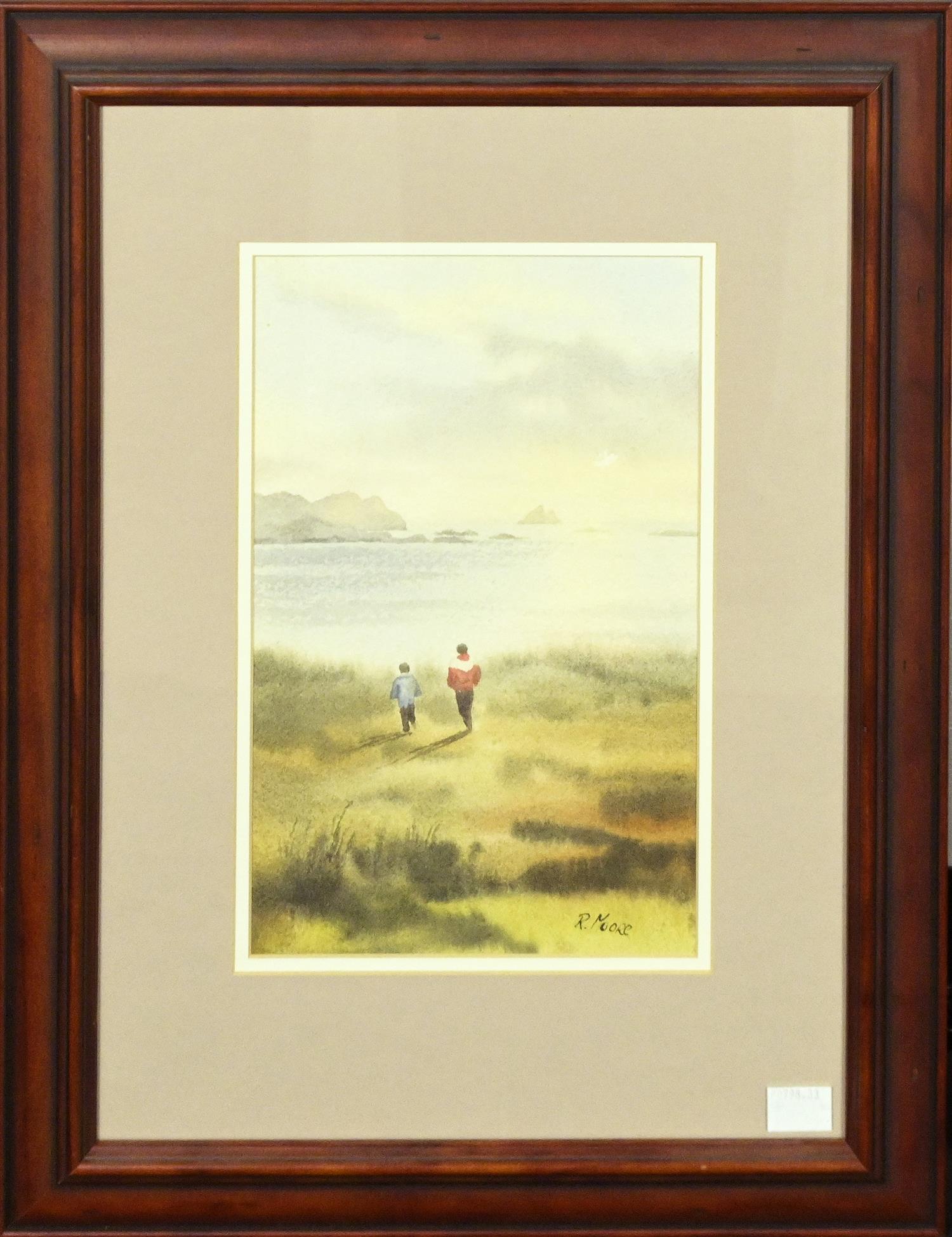 ROD MOORE, (TWO FIGURES WALKING), WATERCOLOUR ON PAPER, SIGNED LOWER RIGHT, 25 X 15.5CM, FRAME SIZE: 43 X 34CM