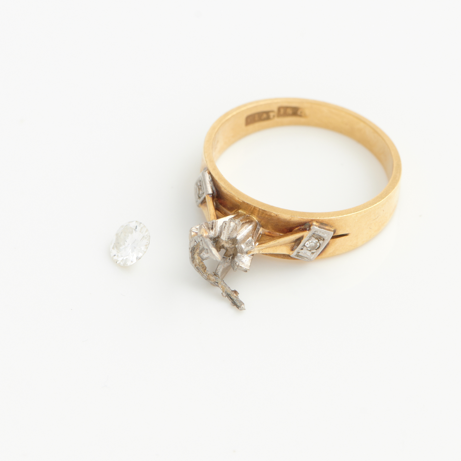 A LOOSE DIAMOND WEIGHING APPROXIMATELY 0.30CTS, TOGETHER WITH A REMOVED RING SHANK IN 18CT GOLD, SIZE M1/2, 4.53GMS