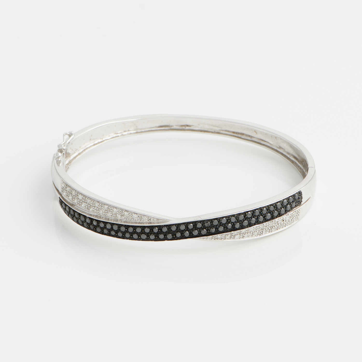 A BLACK DIAMOND AND DIAMOND SET HINGED BANGLE IN 14CT WHITE GOLD, INNER DIAMETER 60MM, 18.0GMS